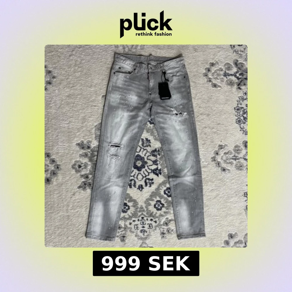 Snygga grå jeans från Dsquared2 med slitningar, färgstänk och coolt tvättad look. Klassisk femficksmodell med Dsquared2-logga på både etikett och bakficka. Perfekta för dig som gillar streetstyle och vill sticka ut.