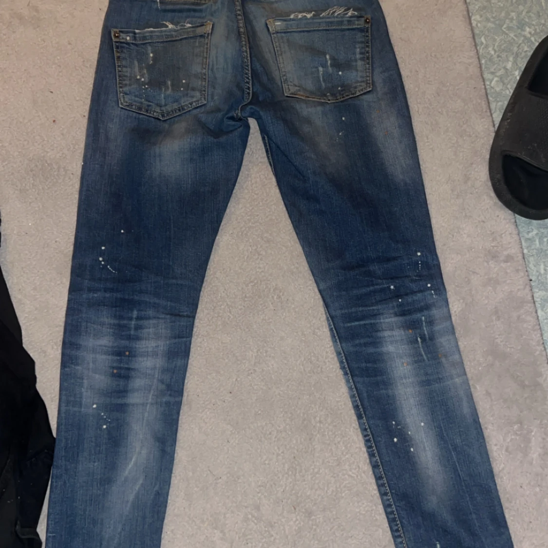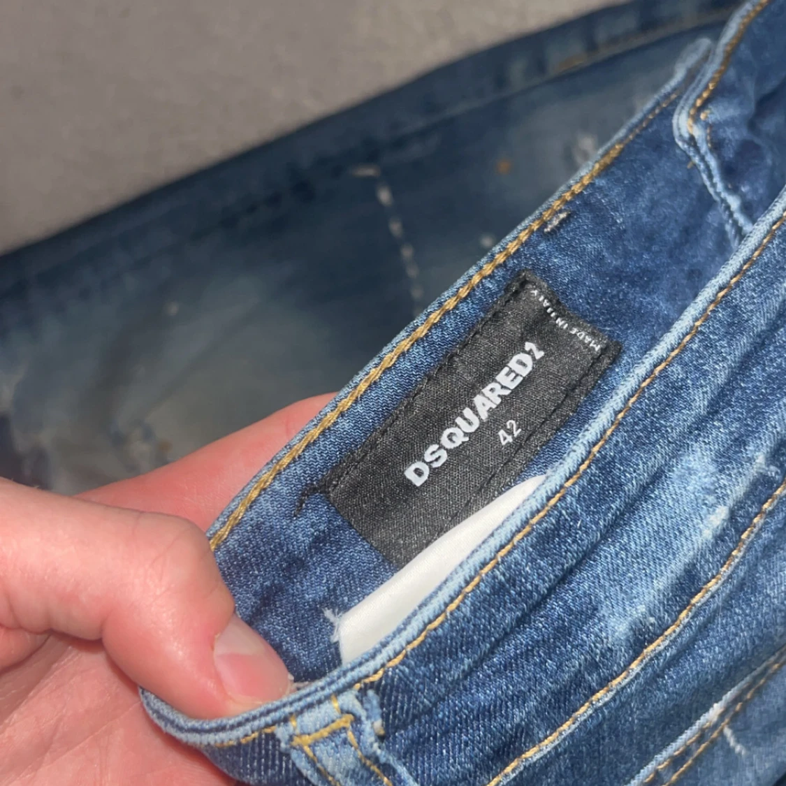Riktigt snygga blå jeans från Dsquared2 med slitningar, hål och färgstänk för en rå streetlook. Jeansen har klassisk femficksdesign, smal passform och coola detaljer som ger dem en unik vibe. Perfekta för dig som gillar statement-plagg. Pris kan diskuteras