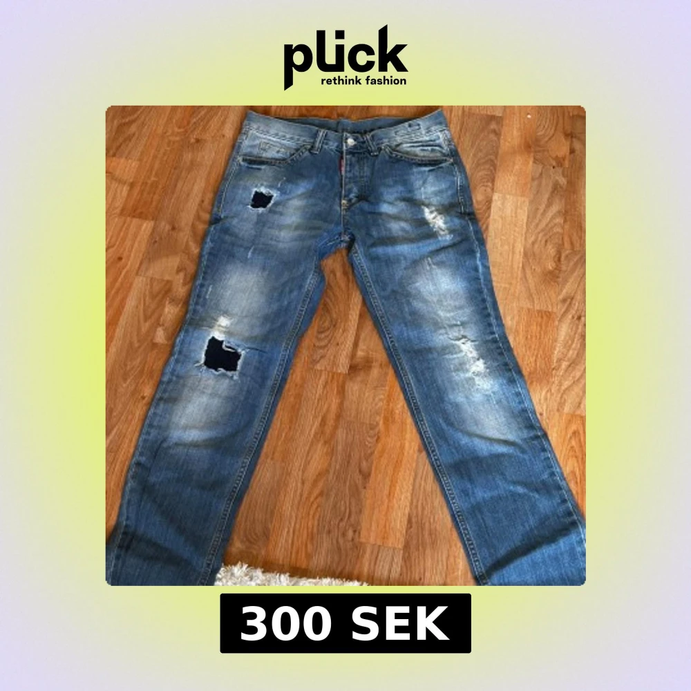 Säljer ett par blå jeans från Dsquared med coola slitningar och hål på låret och knät. Jeansen har klassisk femficksdesign, raka ben och snyggt tvättad finish. Perfekta för dig som gillar en avslappnad och trendig look.