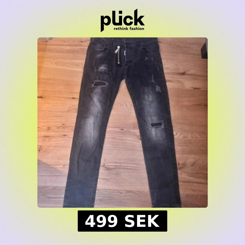 Snygga svarta jeans från Dsquared2 med slitna detaljer och trasiga partier på benen. Modellen är skinny fit med en cool dragkedjedetalj framtill och broderad D-logga på bakfickan. Jeansen har en tvättad look och klassiska fem fickor. Storlek M men passar som S