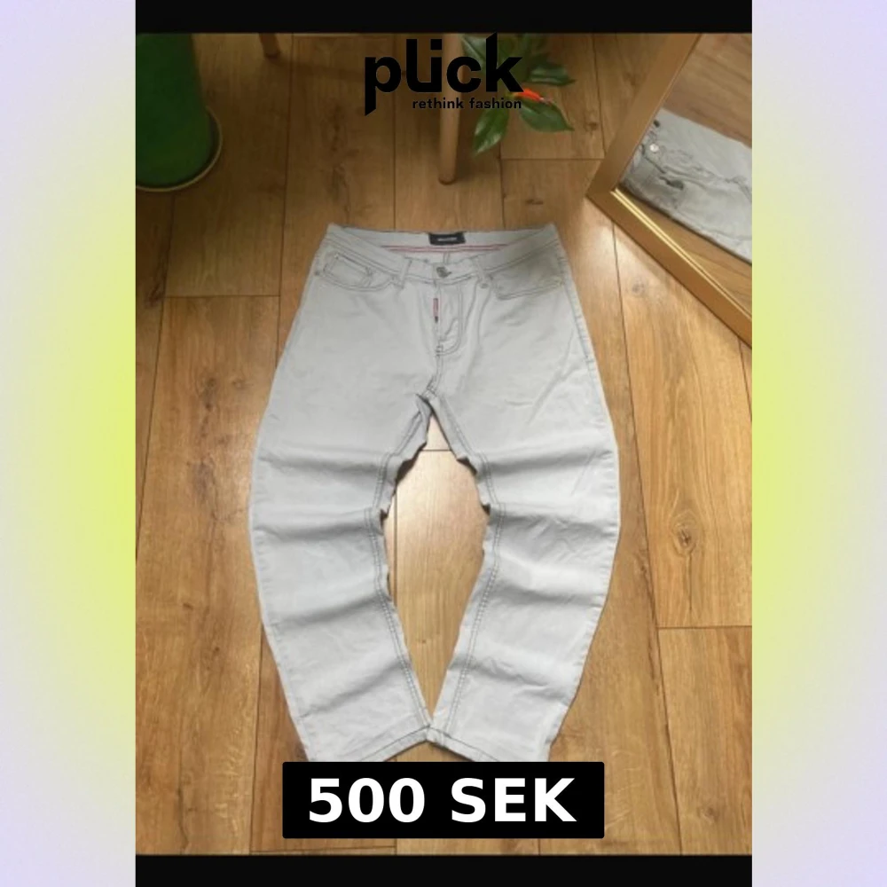 Säljer ett par ljusgrå jeans från Dsquared2. Byxorna har normal passform. Snygg detalj med Dsquared2-logga på knapp och etikett vid gylfen.