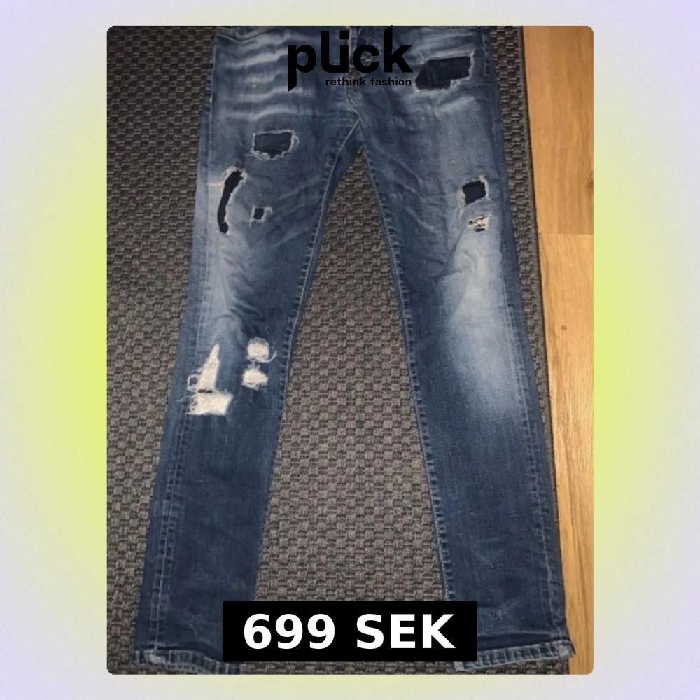 Snygga blå dsquared2 jeans med flera slitningar och hål framtill. Jeansen har en klassisk femficksmodell och är tillverkade i denim med stretch för en bekväm passform. Perfekta för en trendig och avslappnad look.
