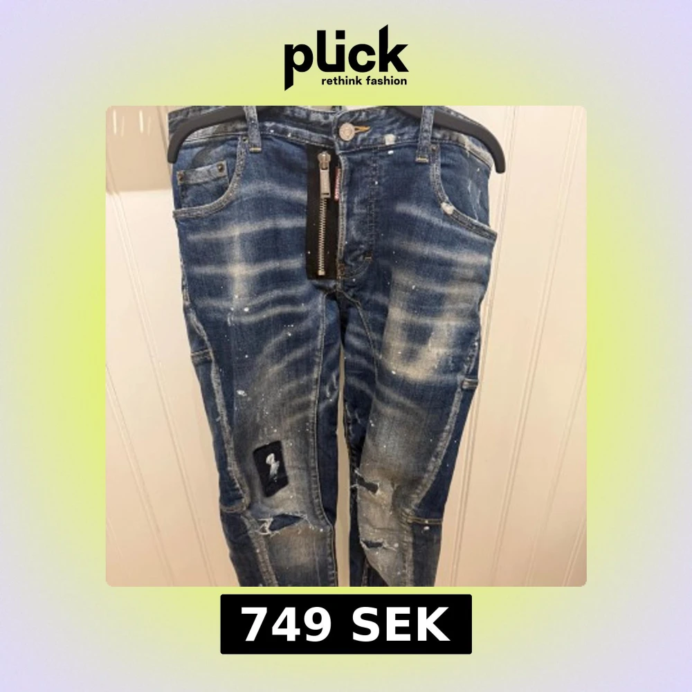 Säljer ett par blå jeans med coola slitningar, patchdetaljer och färgstänk. Byxorna har en stor synlig dragkedja framtill och en avslappnad passform. Perfekta för dig som gillar en edgy streetstil.