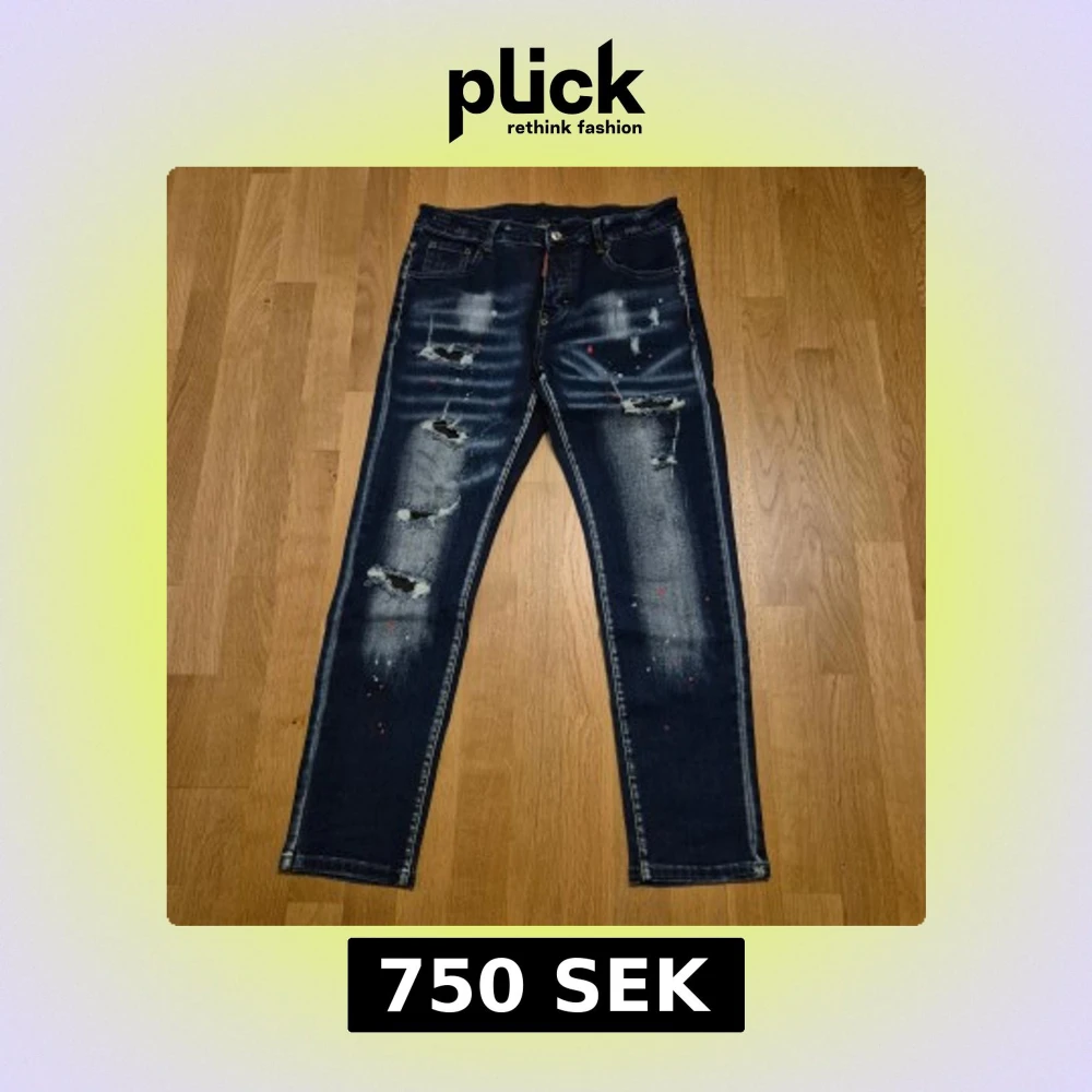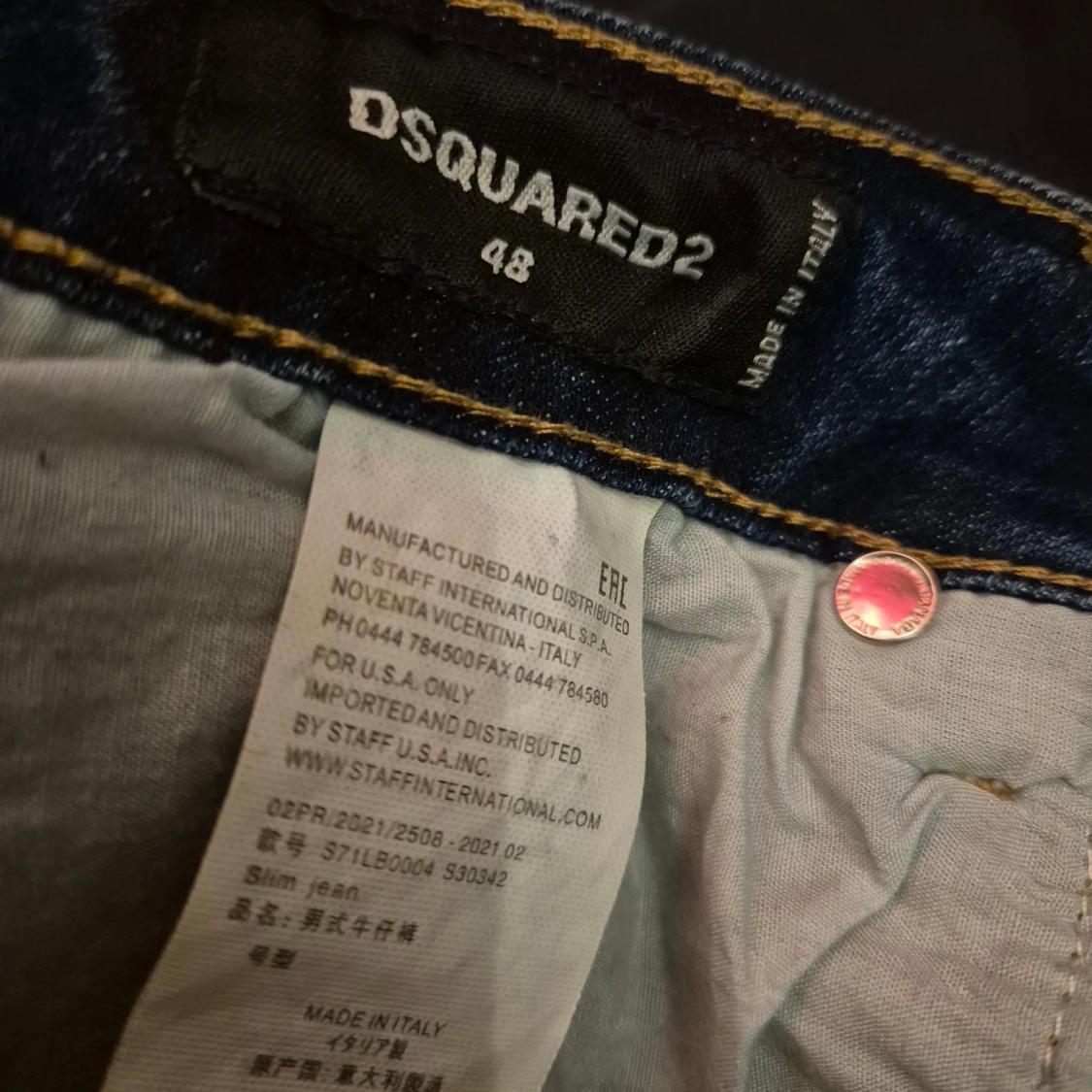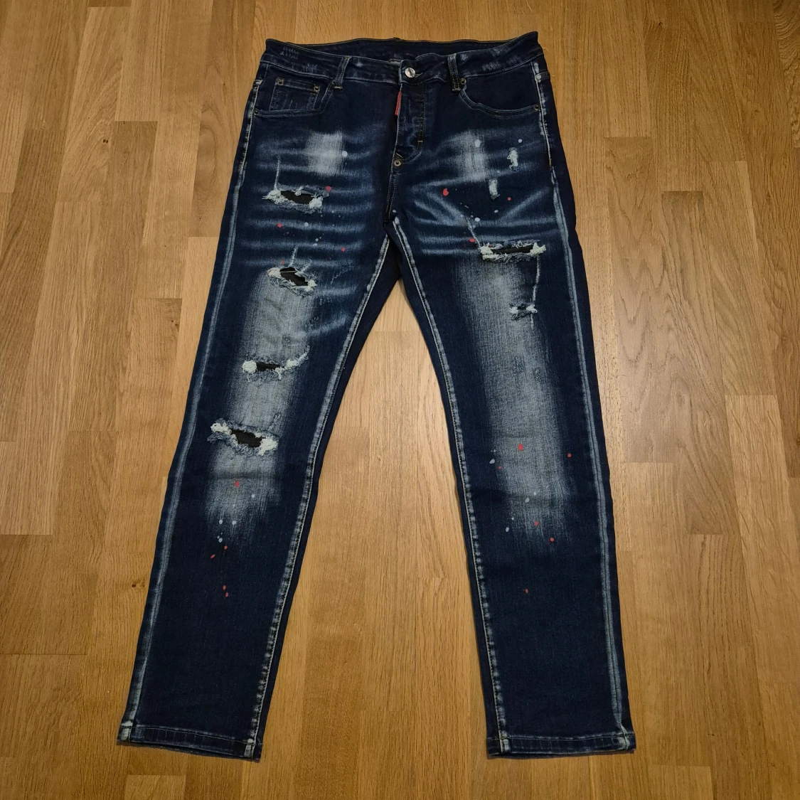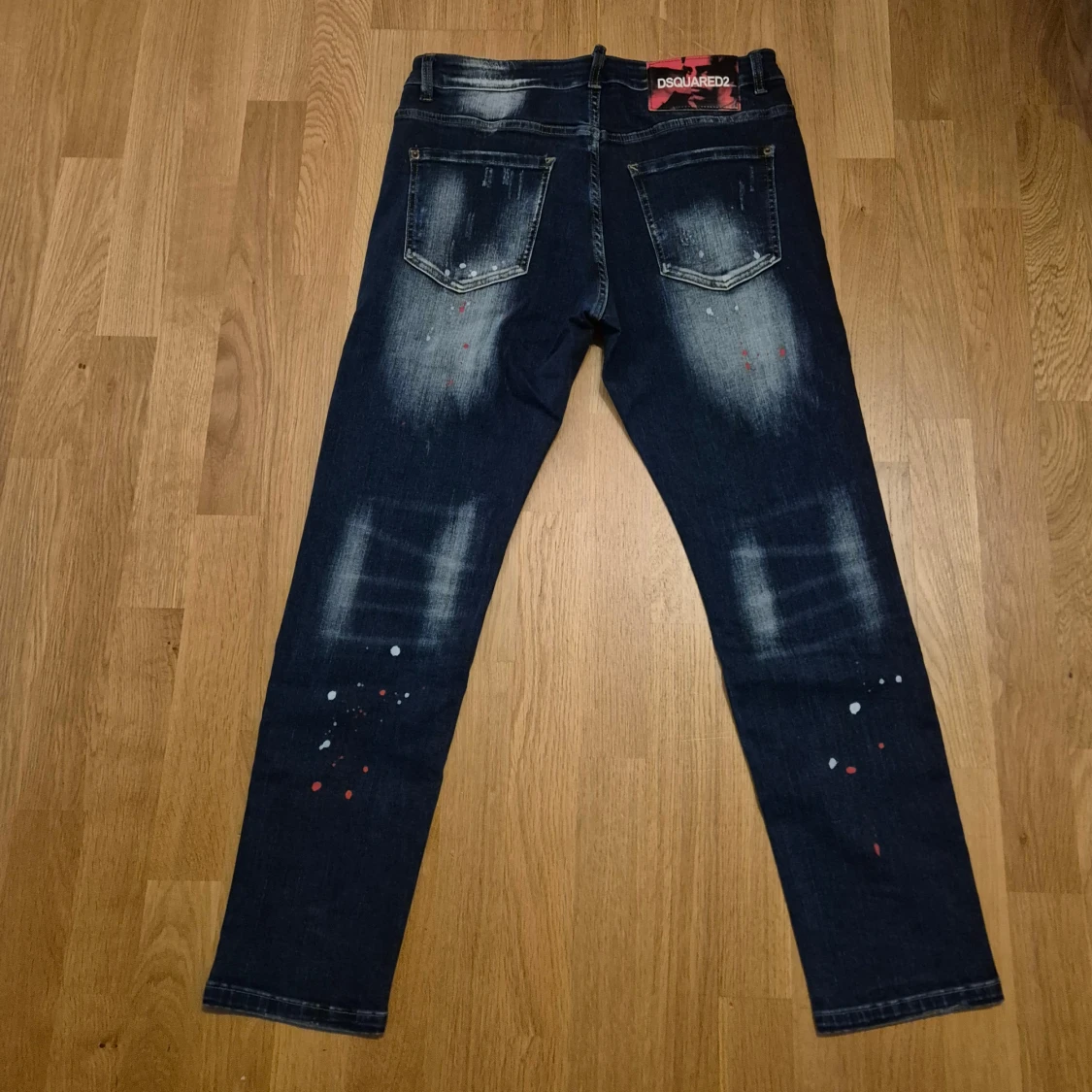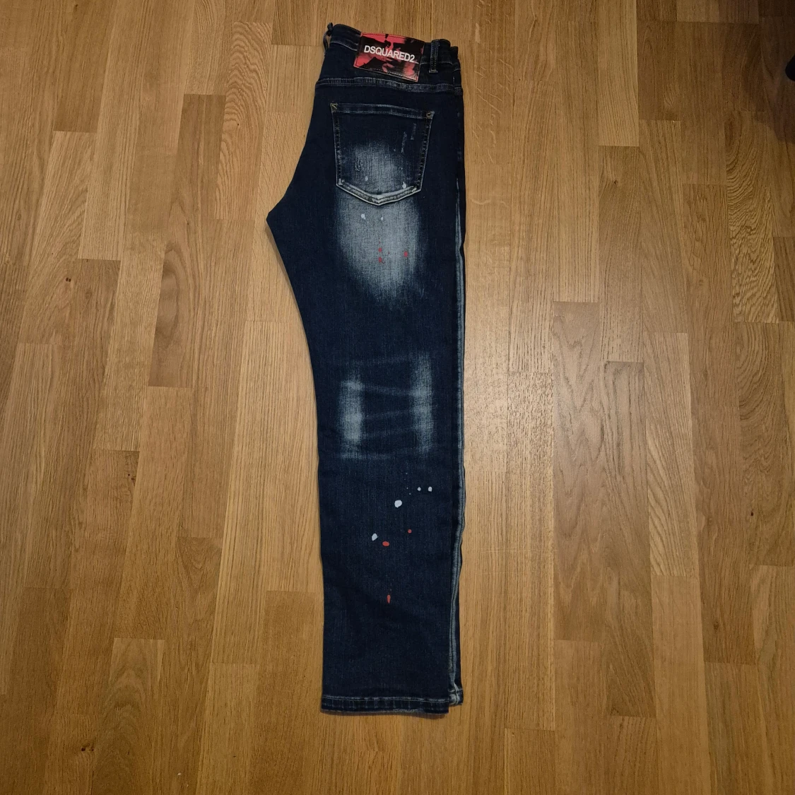 Mörkblå slim fit jeans från Dsquared2 med slitna detaljer, färgstänk och blekta partier. Klassisk femficksmodell med knappgylf och Dsquared2-logga bak i midjan. Snygg streetstil med unik finish, tillverkade i Italien.