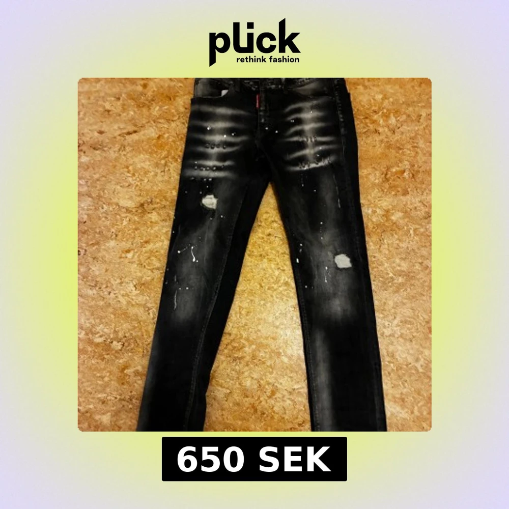 Säljer ett par svarta skinny jeans från Dsquared2 med coola slitningar, färgstänk och distressed detaljer på framsidan. Jeansen har en smal passform, klassisk femficksdesign och är tillverkade i stretchig bomull för skön komfort.