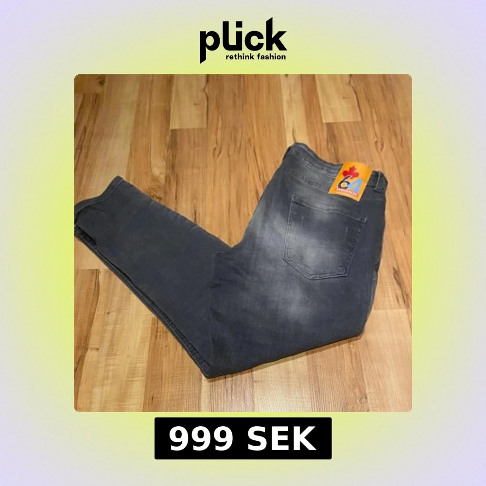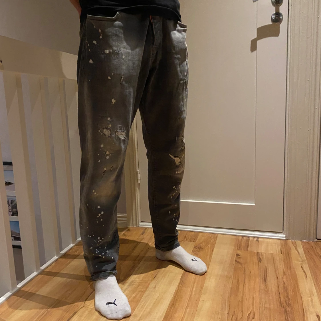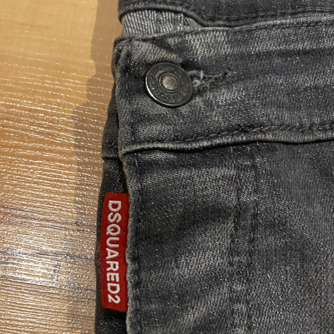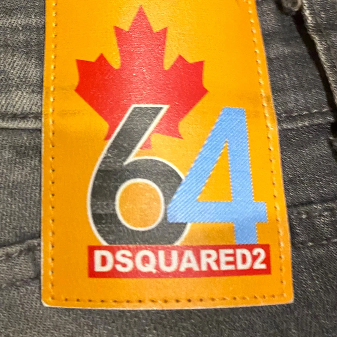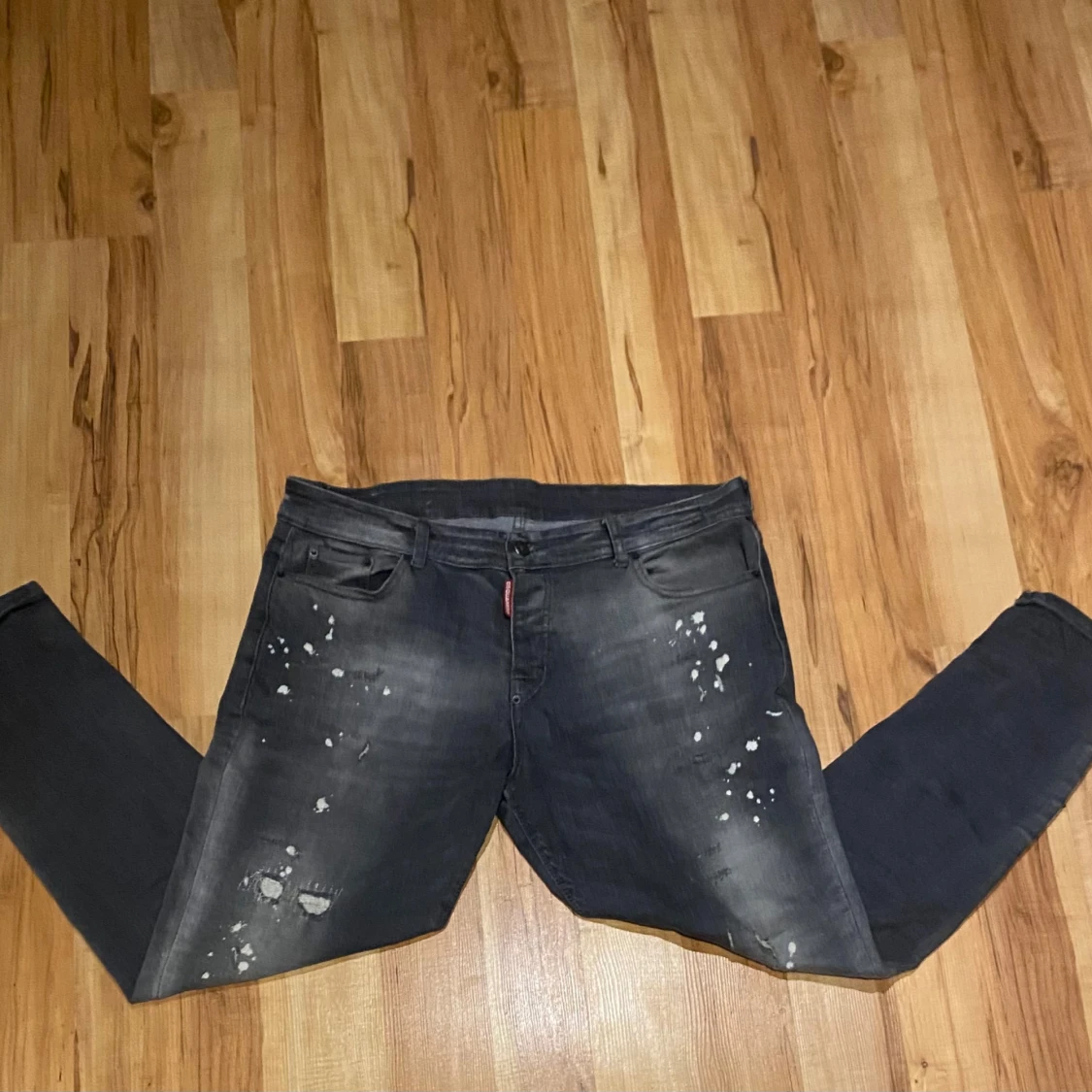 Säljer ett par svarta Dsquared2 jeans med coola slitningar och färgstänk framtill. Jeansen har klassisk femficksdesign, Dsquared2-logga på bakfickan och röd etikett vid fickan. Snyggt tvättade för en trendig look och tillverkade i jeansmaterial.