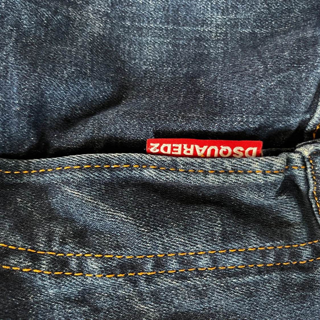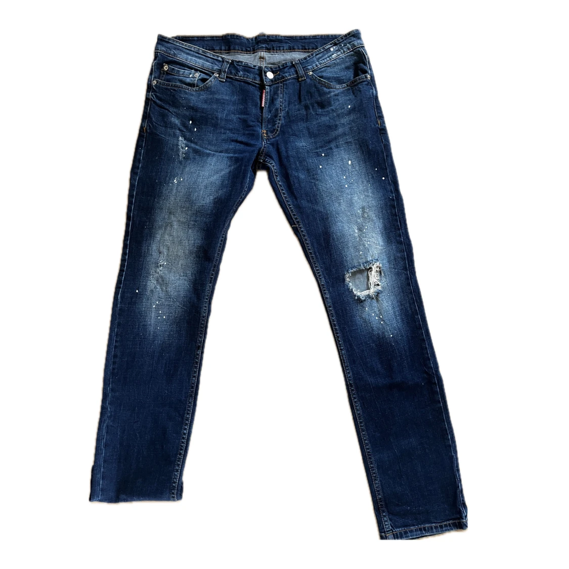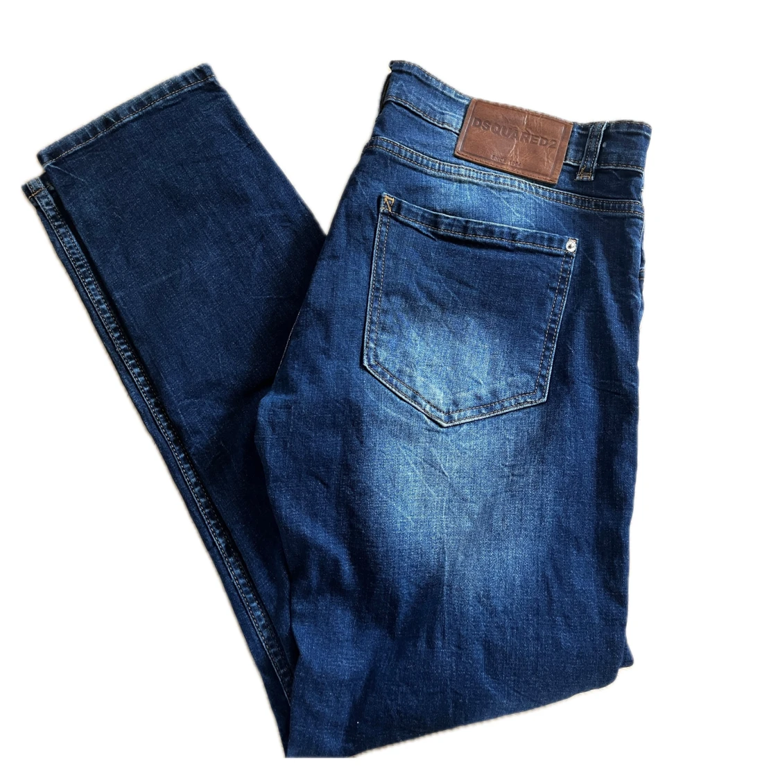 Säljer ett par snygga blå jeans från Dsquared2. De har en cool distressed look med slitningar och färgstänk som ger en unik stil. Perfekta för en casual outfit med en t-shirt eller hoodie. Jeansen har en klassisk femficksdesign och en bekväm passform