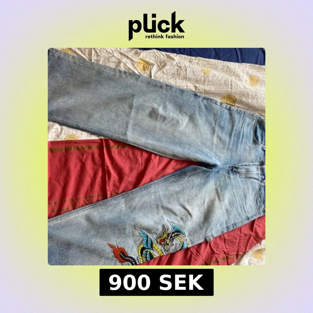Jeans från Ed Hardy med stor broderad drake i färg på ena benet och svart Ed Hardy-logga på baksidan. rak baggy passform.