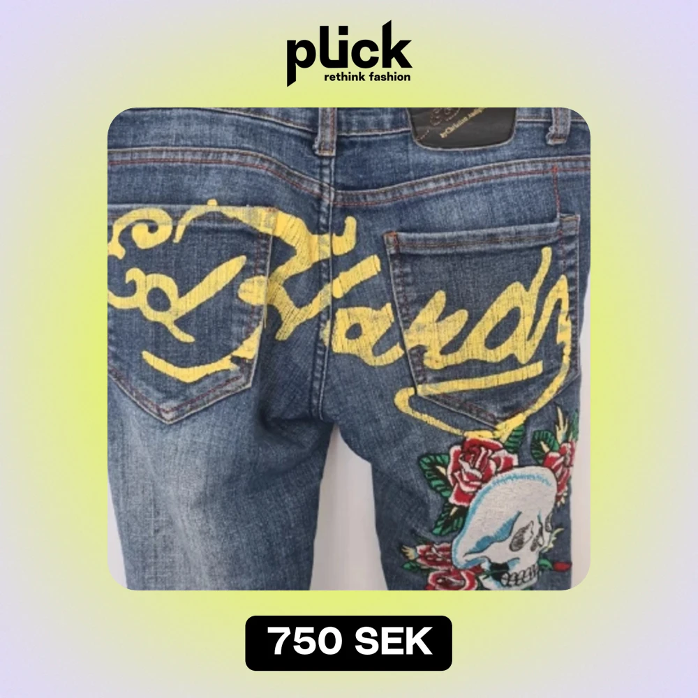 As snygga ed hardy jeans med tryck på baken och broderi med blommor och en döskalle. Skriv vid frågor