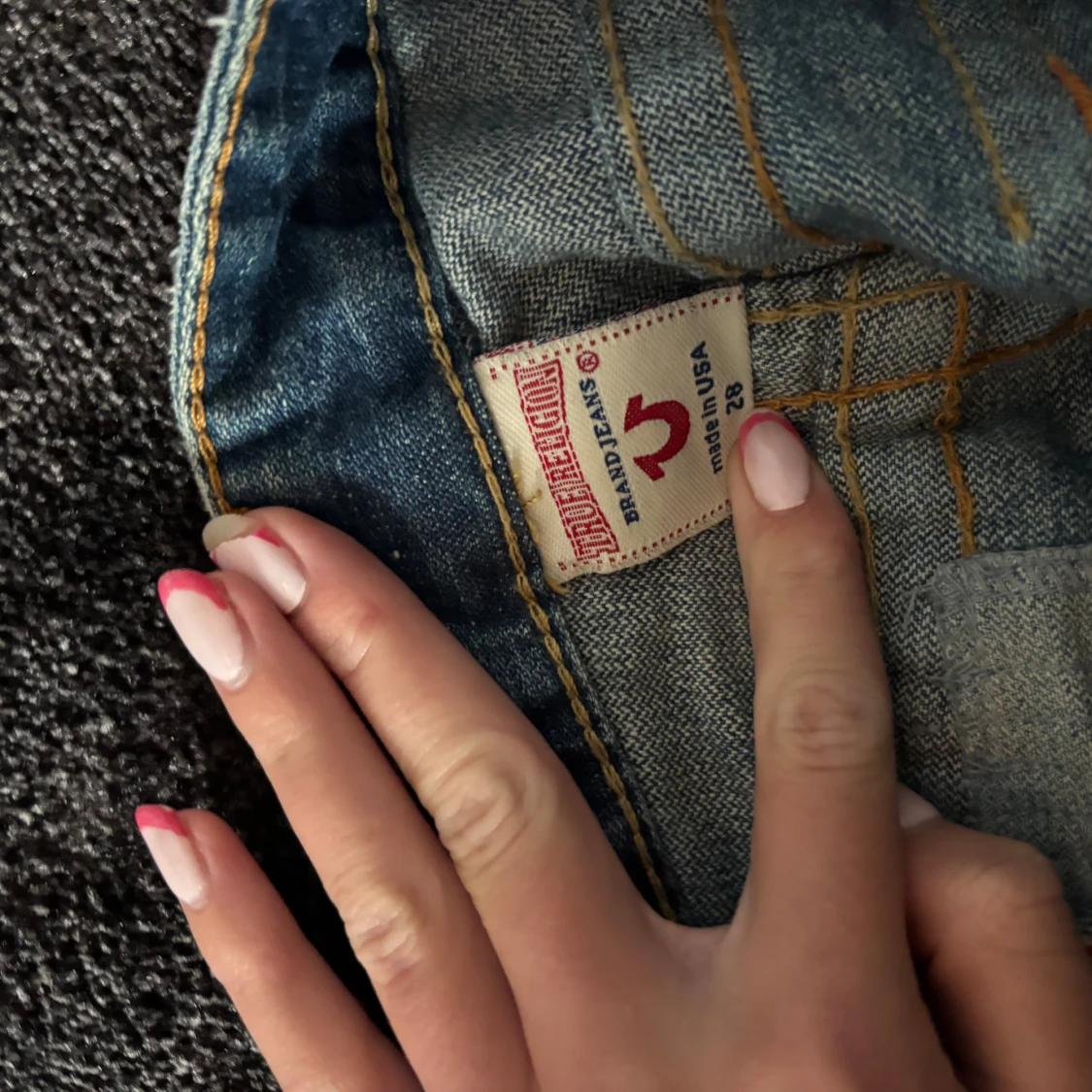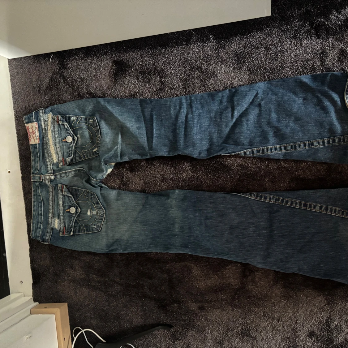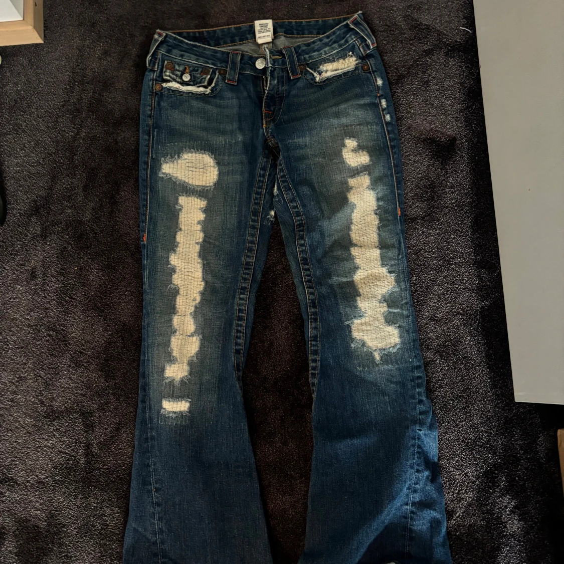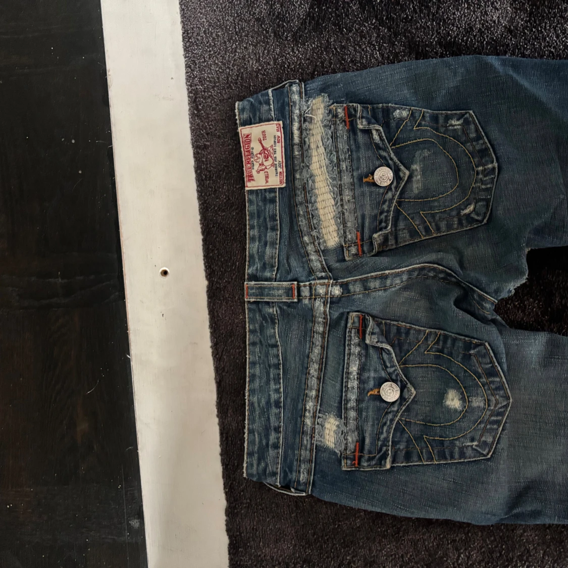 Säljer ett par blå bootcut jeans från True Religion med slitna detaljer och kontrastsömmar. Jeansen har låg midja, klassiska fickor med lock bak och tydliga slitningar framtill för en edgy look. Tillverkade i kraftig denim med snygg tvätt.