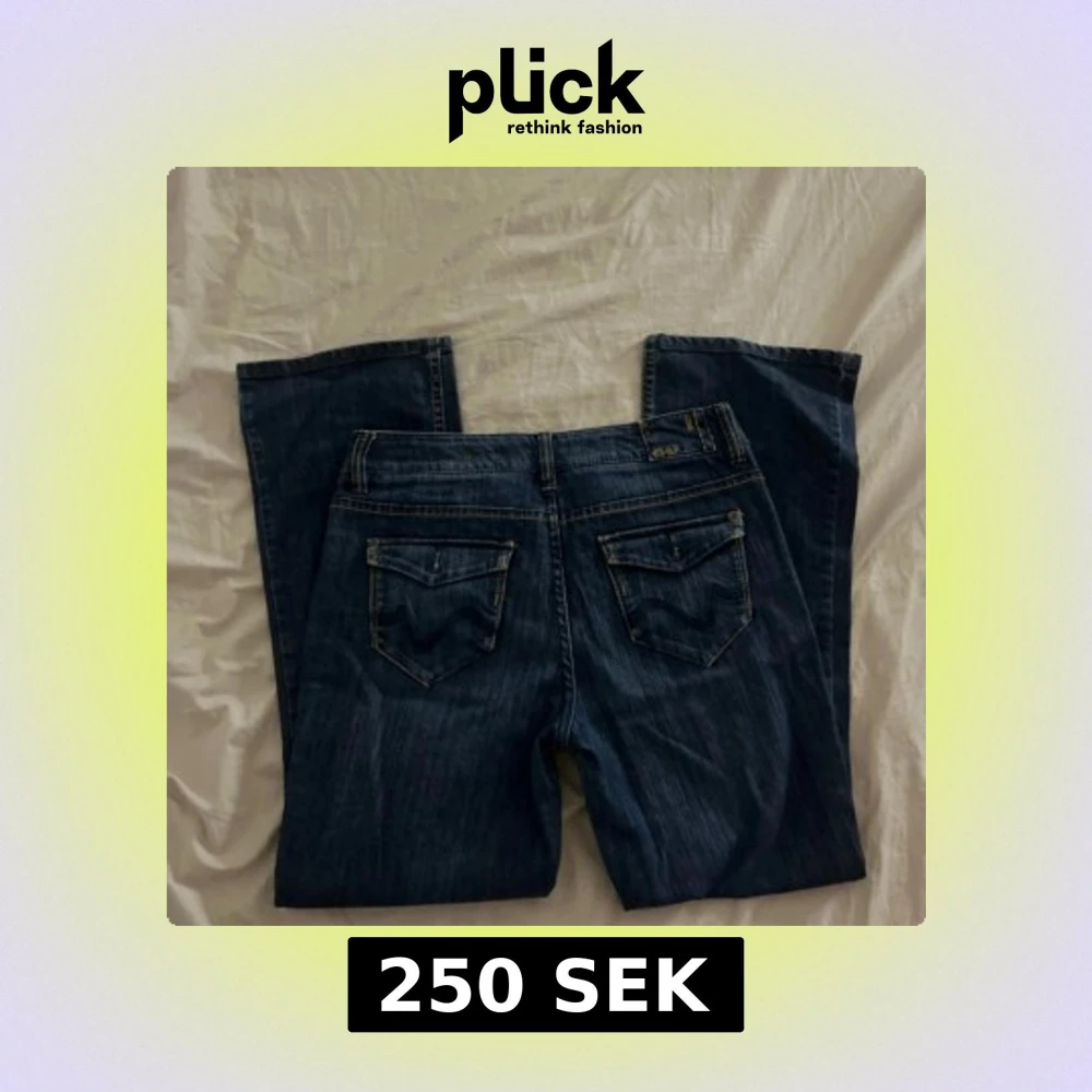 Snygga mörkblå jeans från Esprit med klassisk femficksdesign och kontrastsömmar. Jeansen har utsvängda ben. Innebenslängden är 74cm och midjemåttet är 40cm💕💕💕