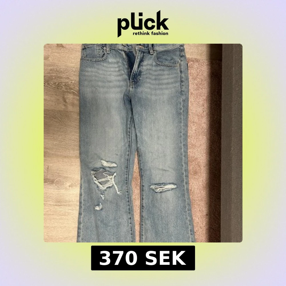 Snygga blå bootcut jeans i relaxed fit med slitna detaljer och hål på benen. Jeansen har midwaist och klassisk femficksdesign. Perfekta för dig som gillar en avslappnad och trendig look. Helt nya endast provade men kan inte skicka tillbaka pågrund av lappen är borta