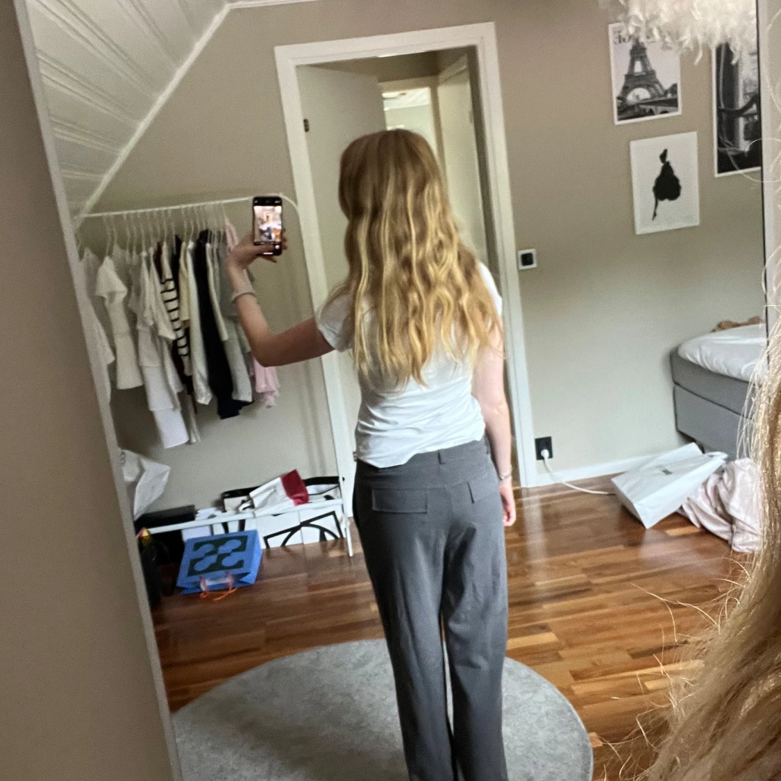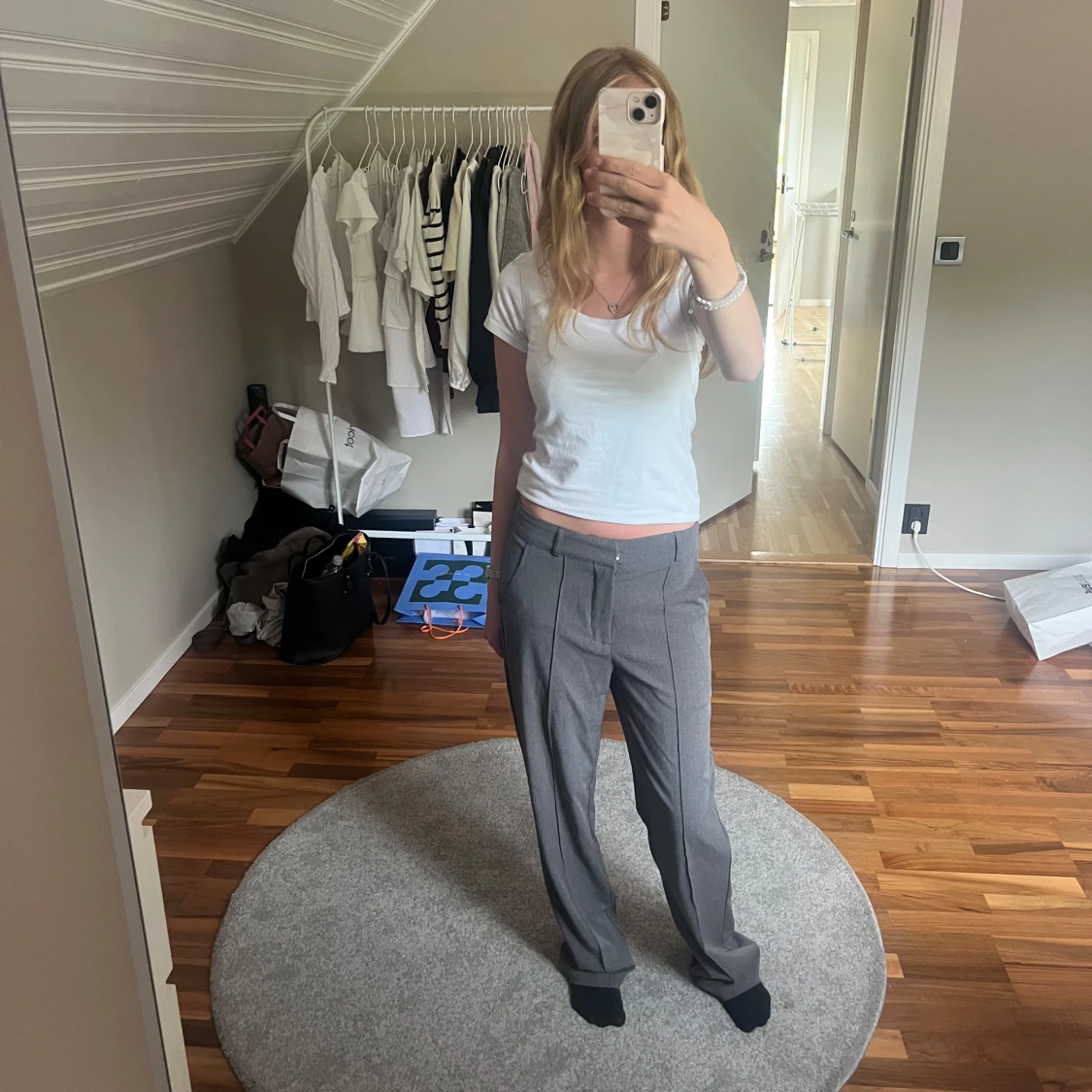 Snygga grå kostymbyxor från Madlady i klassisk modell med pressveck och raka ben. Byxorna har hällor för bälte, fickor bak och är midwaist. Perfekta för en clean och stilren look, passar till både sneakers och boots. Aldrig använda men prislappen är tyvärr inte kvar.