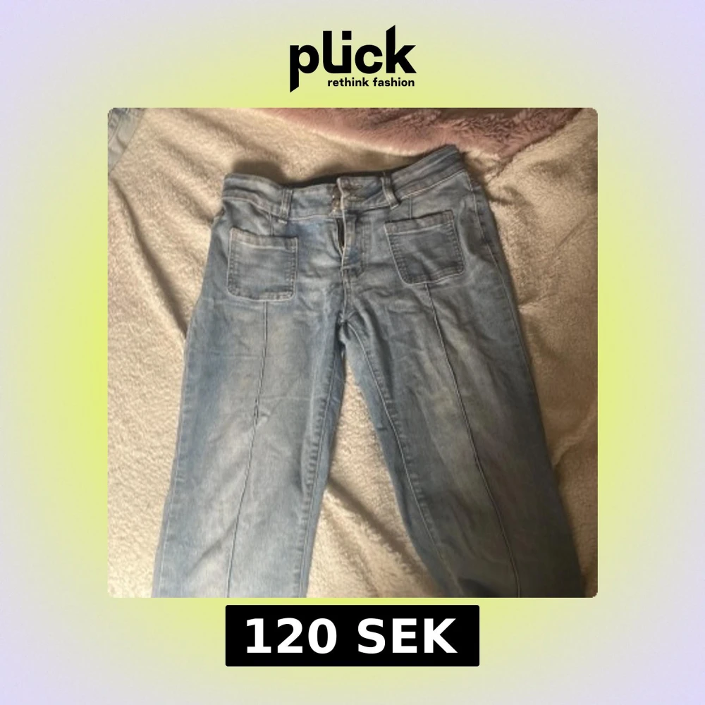 Säljer ett par ljusblå jeans från Madlady i storlek 38 short. Jeansen har raka ben, stora fickor fram och bak med knappdetaljer, samt klassisk jeanssöm. Perfekta om du gillar ljusare jeans
