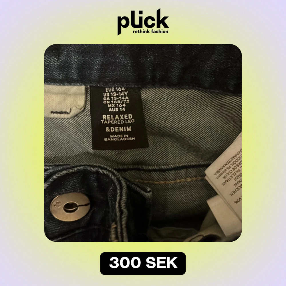 Säljer ett par mörkblå jeans från &Denim i storlek EUR 164. De har en relaxed tapered fit som ger en skön och avslappnad stil. Perfekta för både vardag och fest.
