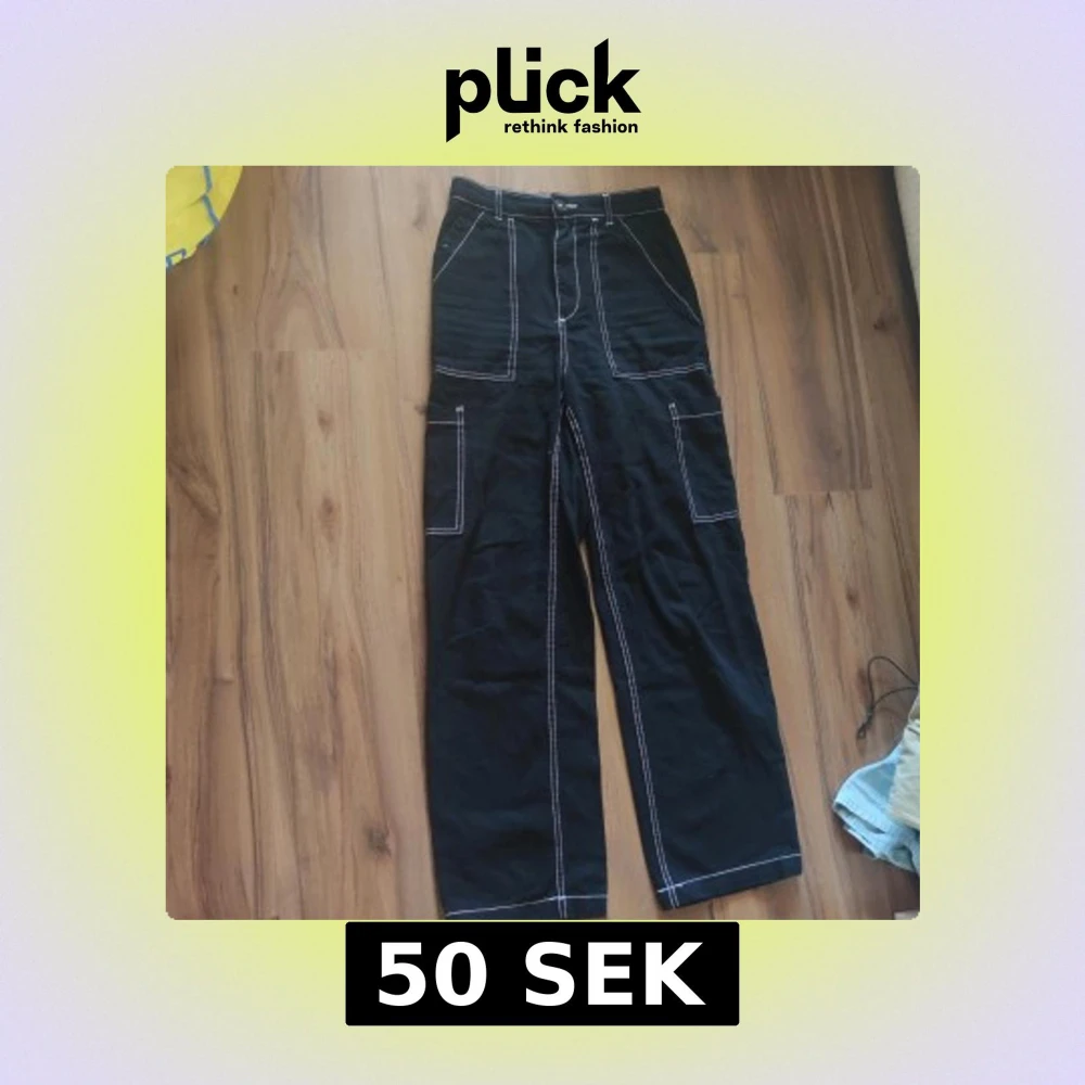 Svarta cargopants från H&M DIVIDED med kontrasterande vita sömmar och flera stora fickor både fram och bak. Byxorna har en loose passform och raka ben, tillverkade i bomull. Perfekt för dig som gillar streetstyle och funktionella detaljer.