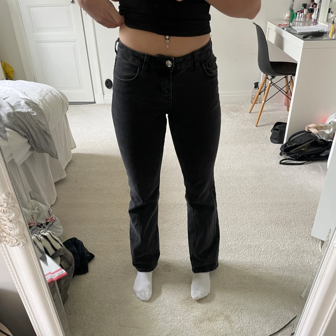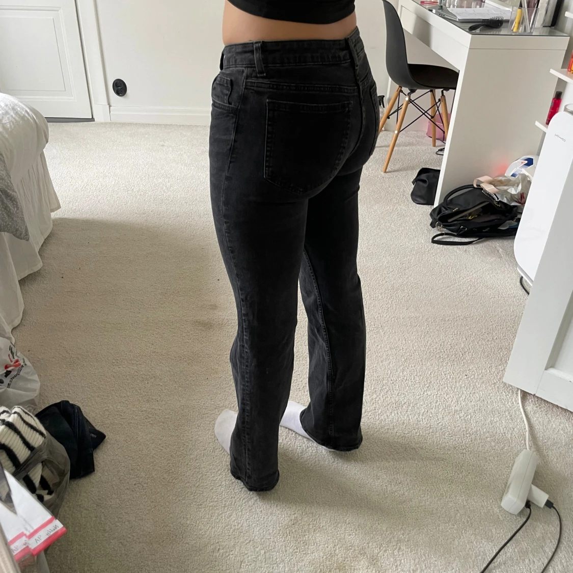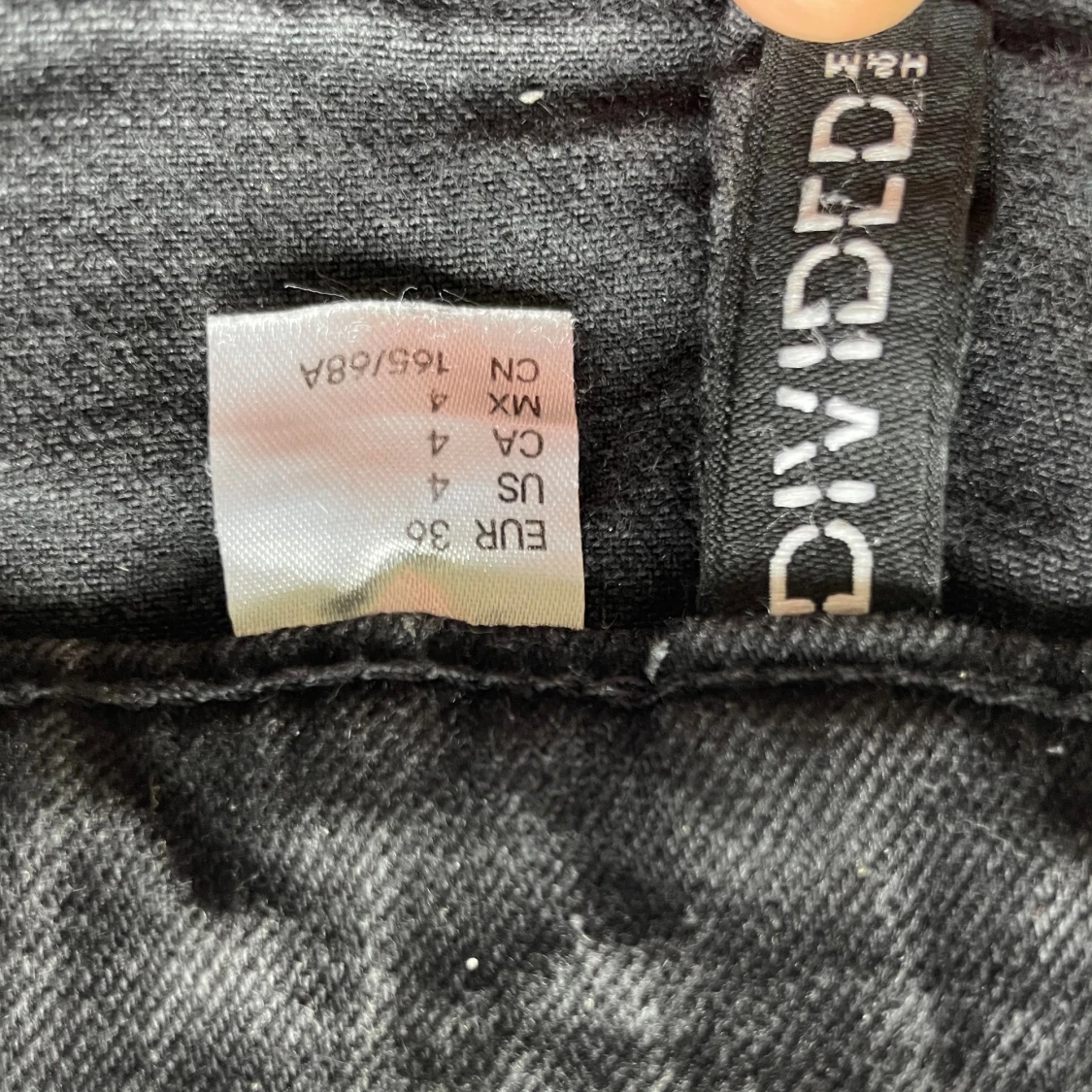 Svarta jeans från H&M Divided med normal passform och klassisk femficksdesign. Jeansen har hanska låg midja. Säljs pga att de inte används!