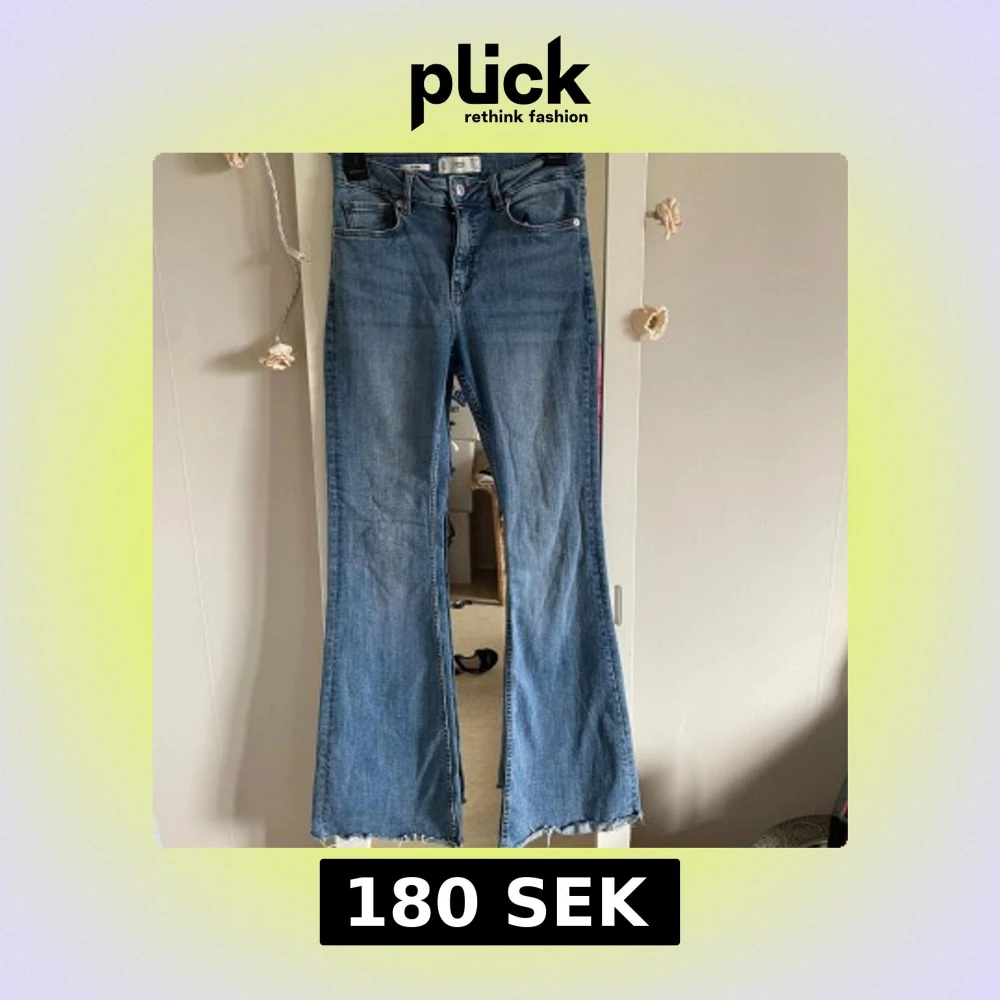 Säljer ett par blå bootcut jeans från MNG Denim med råa, fransiga benslut. Jeansen har klassisk femficksdesign och hög midja. Perfekta för dig som gillar en retroinspirerad look med lite extra vidd nertill.tyget är stretch