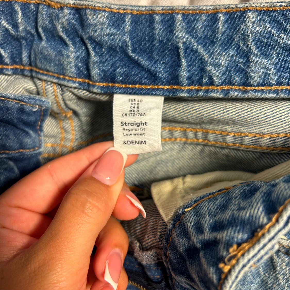 Säljer ett par ljusblå jeans från H&M i rak modell med låg midja. Jeansen har klassisk femficksdesign och regular fit, perfekta för en chill och avslappnad look. Materialet är mjukt denim och färgen är snyggt tvättad för en vintage vibe.