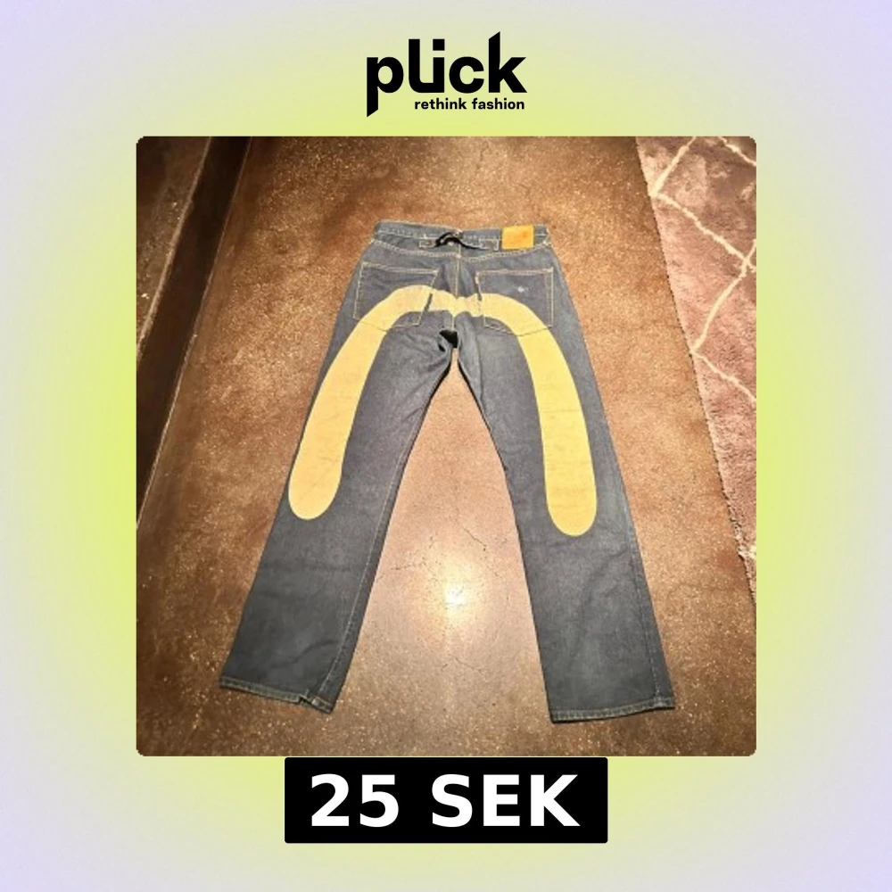 Säljer ett par klassiska Evisu jeans i mörkblå denim med den ikoniska handmålade gula bågen på baksidan. Jeansen har raka ben, tydliga kontrastsömmar och klassisk femficksdesign. Perfekta för dig som vill sticka ut med streetwear-vibe. Märks att dom är used då det finns slight cracks som man ser på bild, men går solklart att rocka