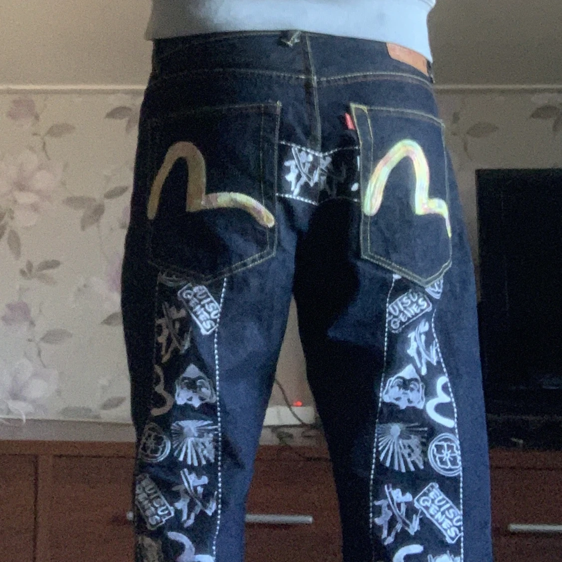 Säljer dessa svinsnygga evisu jeans då de inte kommer till användning. De är i storlek 31/32 och jag är 170 så på bilderna ser ni hur de sitter på mig. Pris 1000kr skriv privat om ni undrar över något!