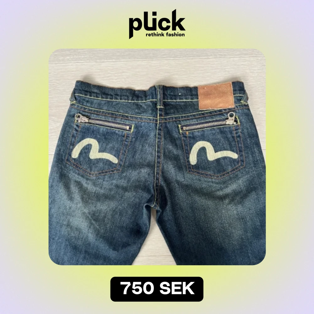 Dösnygga äkta Evisu jeans med coola detaljer! Jeansen är lågmidjade och har greenwash. De är i mycket bra skick med inga skador. Raktöver midjan: 43cm the flare raktöver: 22cm ytterbenslängd: 95cm Kontakta vid frågor och intresse<3