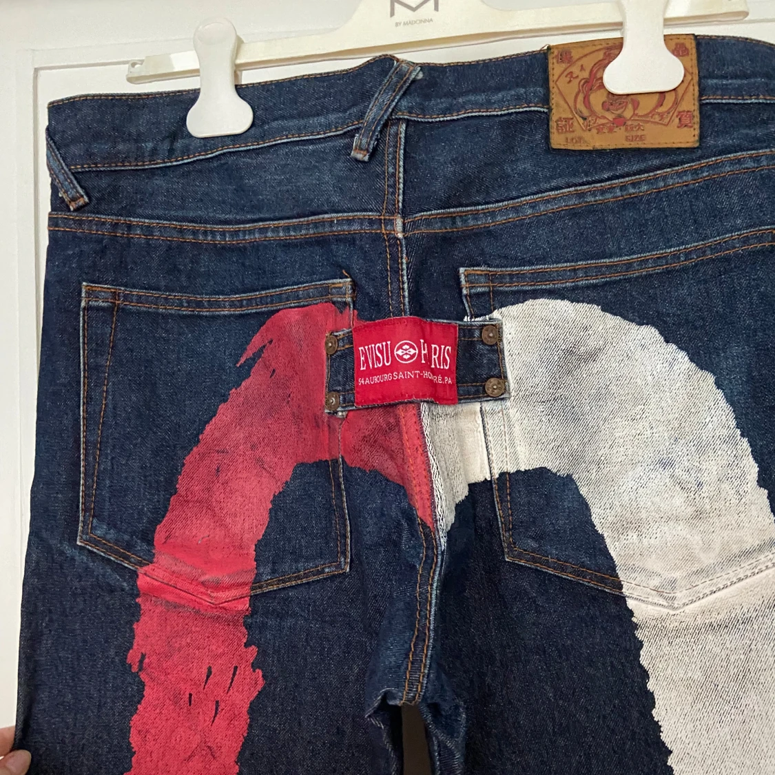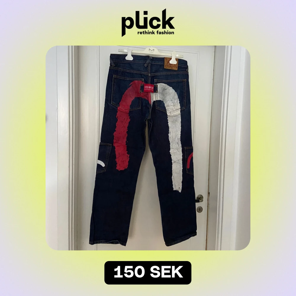 Riktigt coola Evisu jeans 👖Storlek W34, midjemått ca 90cm (45x2). Fint skick, sömmen har lossnat lite i skrevet, men inget som stör eller syns när byxorna är på. Ingen aning om dem är äkta, köpte själv secondhand, men säljer billigt pga är osäker på det. Superfint skick annars!