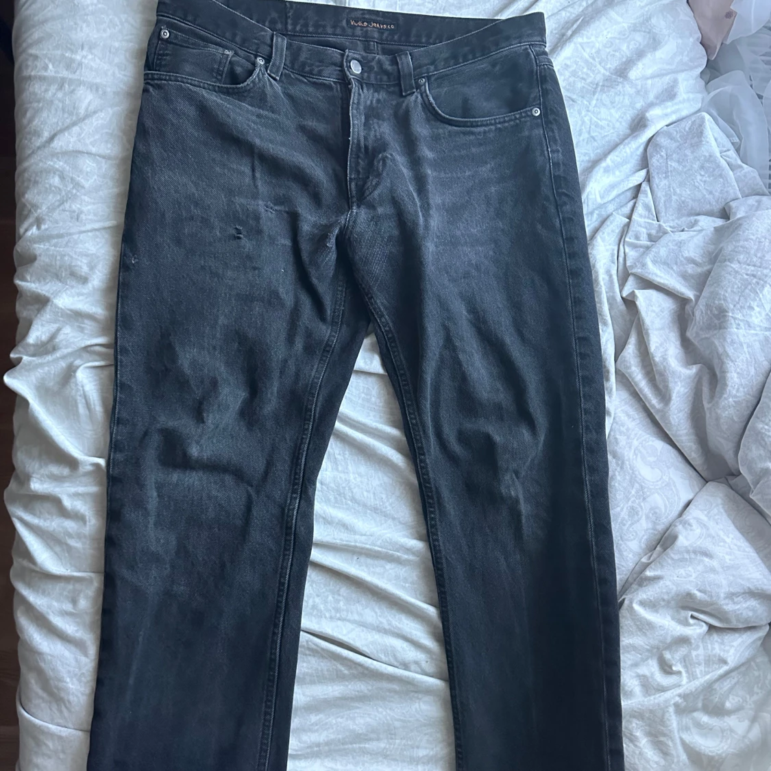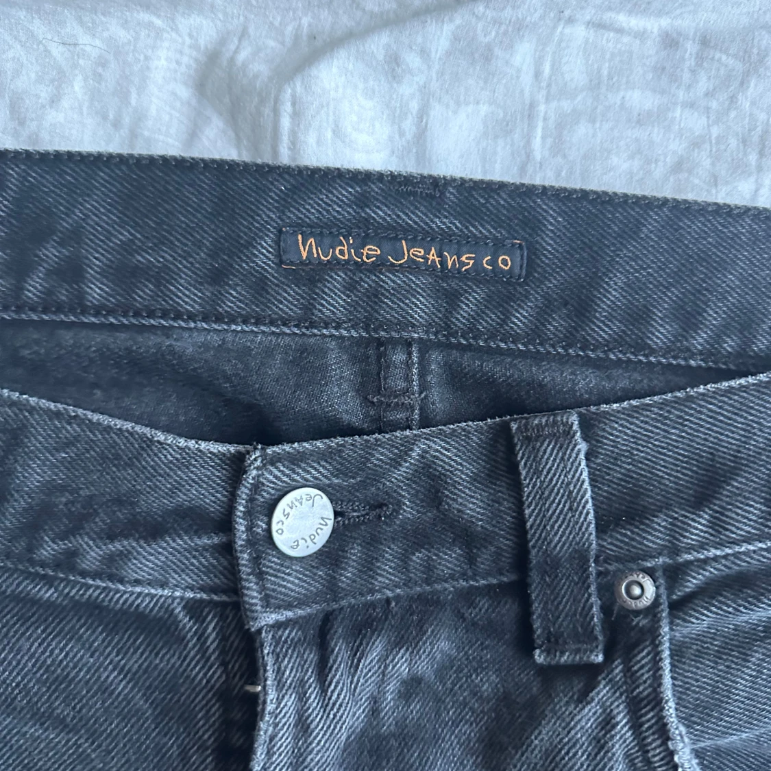 Säljer ett par svarta jeans från Nudie Jeans med klassisk femficksdesign och silverfärgad knapp. Jeansen har en rak passform och är tillverkade i denim. Perfekta till vardags för en stilren look. Storlek 34/32 men passar även 36/32