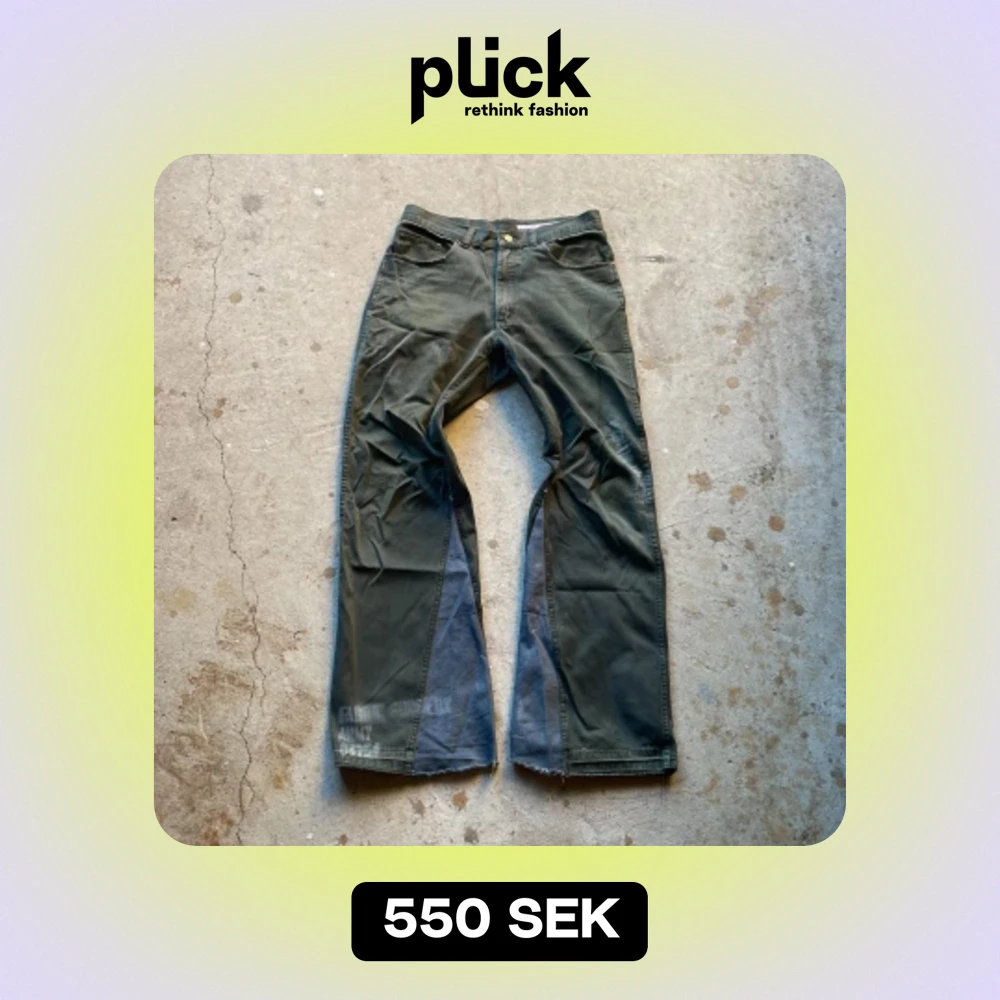 Flared byxor med sprayed detaljer. Vintage skick med heel-bite. Bootcut passform