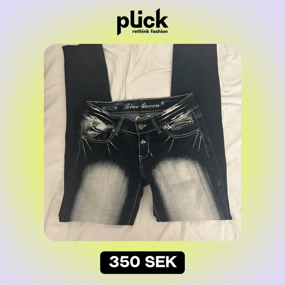 Säljer ett par low waist mörkblåa jeans från Blue Queen med coola broderade detaljer på bakfickorna. De har en snygg fade framtill och en dragkedja vid fickan. De är skinny men jag har klippt en slit så de ser bootcut-ish från sidan