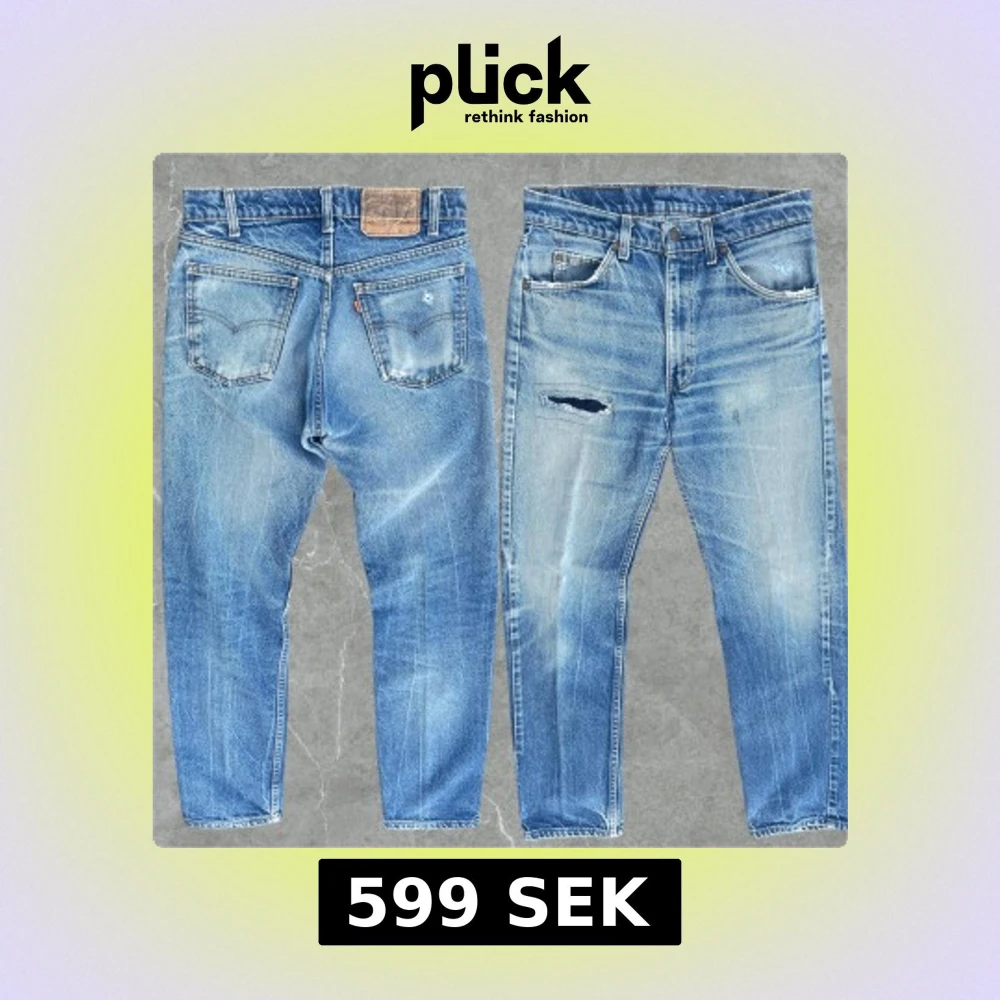 Snygga Levis jeans med slitningar och snygg Fade. Jeansen har en liten fläck (se sista bilden) midjan är 38 cm och längden 102 cm. Storleken är uppskattad så dubbelkolla mått!
