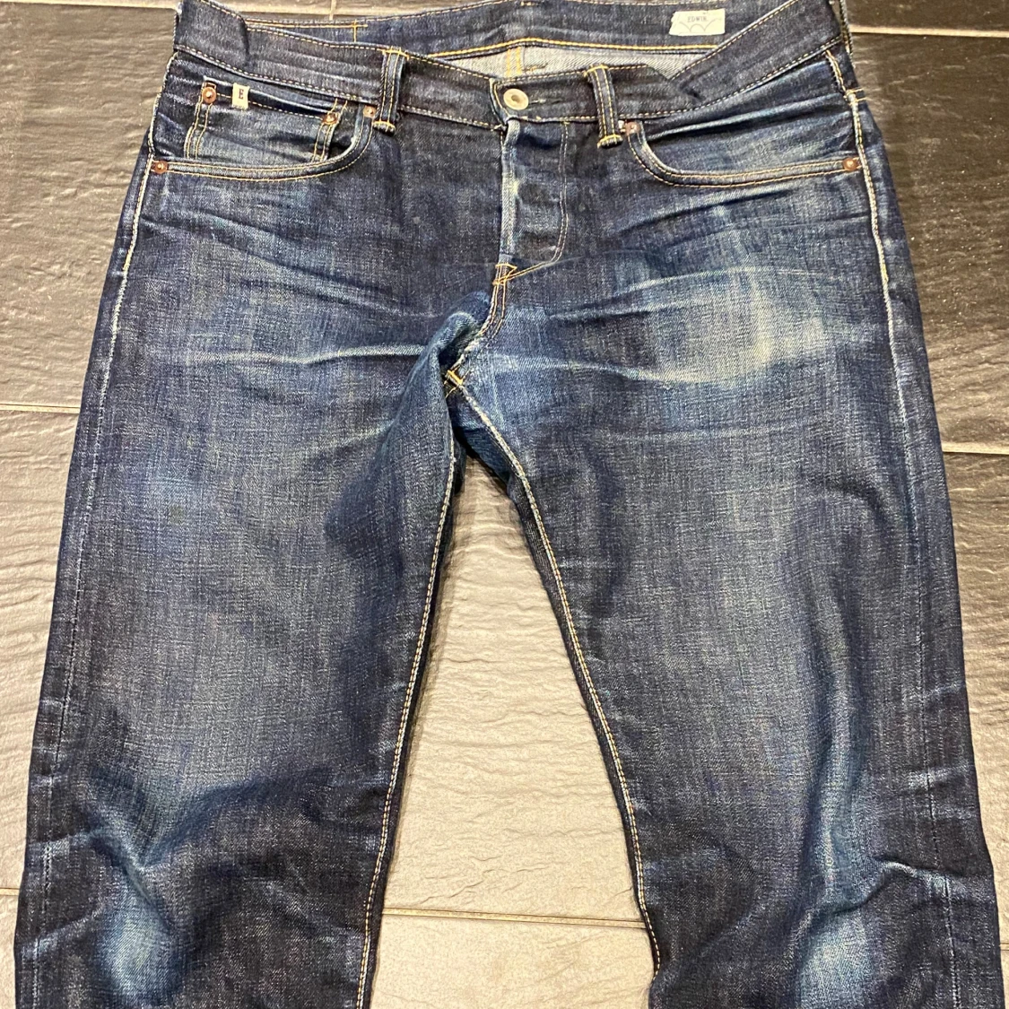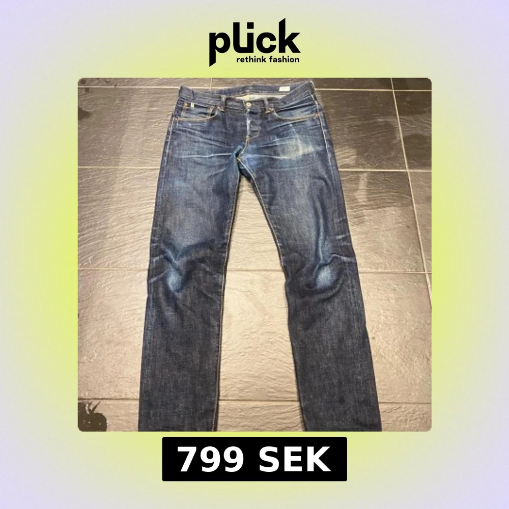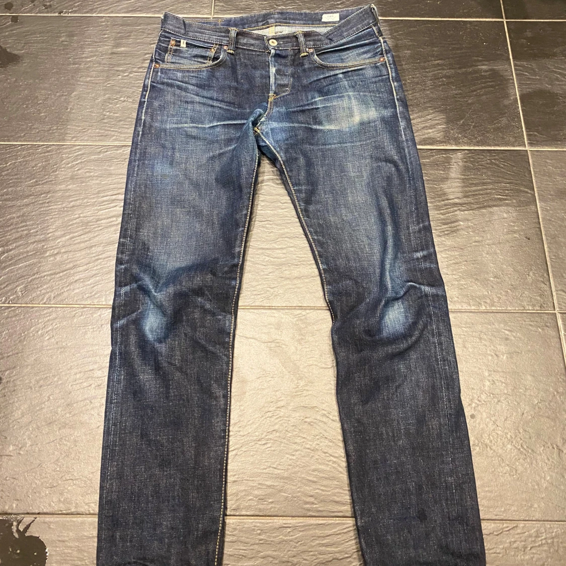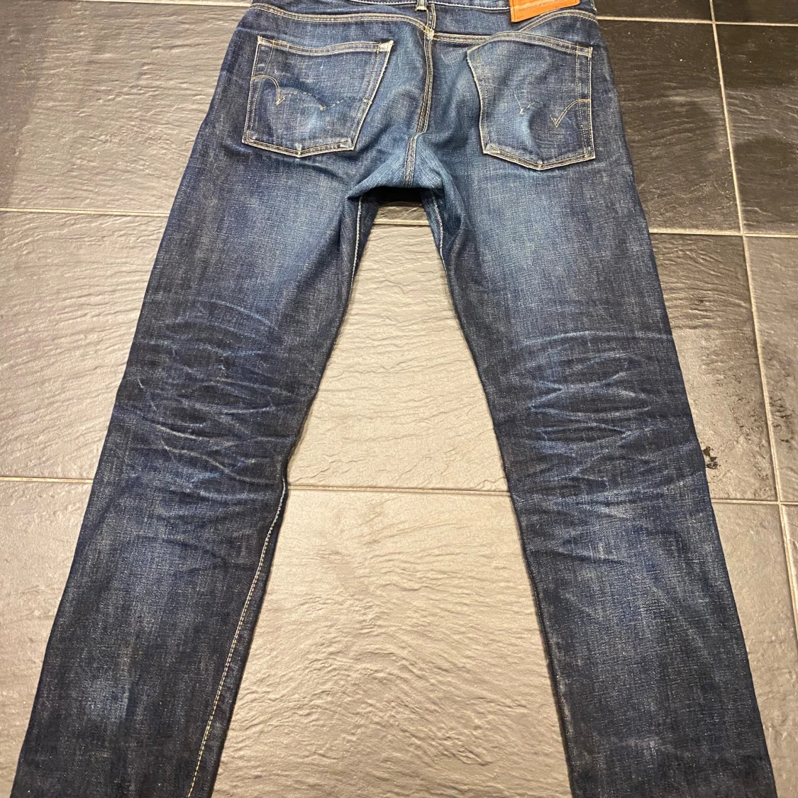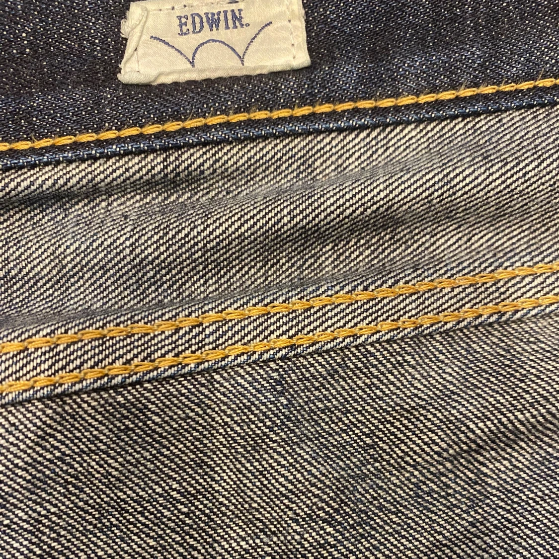 Säljer ett par mörkblå jeans från Edwin med klassisk femficksdesign och snygga slitningar framtill. Jeansen har raka ben och kontrastsömmar i gult. Perfekt för dig som gillar en tidlös och stilren look.
