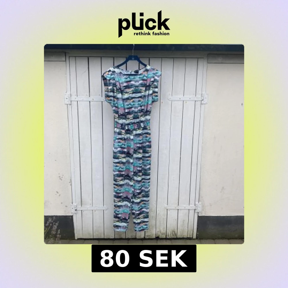 Jumpsuit från Lindex i storlek 34 med unikt abstrakt mönster i blått, lila, svart, turkos och inslag av orange. Modellen har kort ärm, markerad midja och långa ben. Mjuk och lätt i materialet, perfekt för dig som gillar färg och mönster.