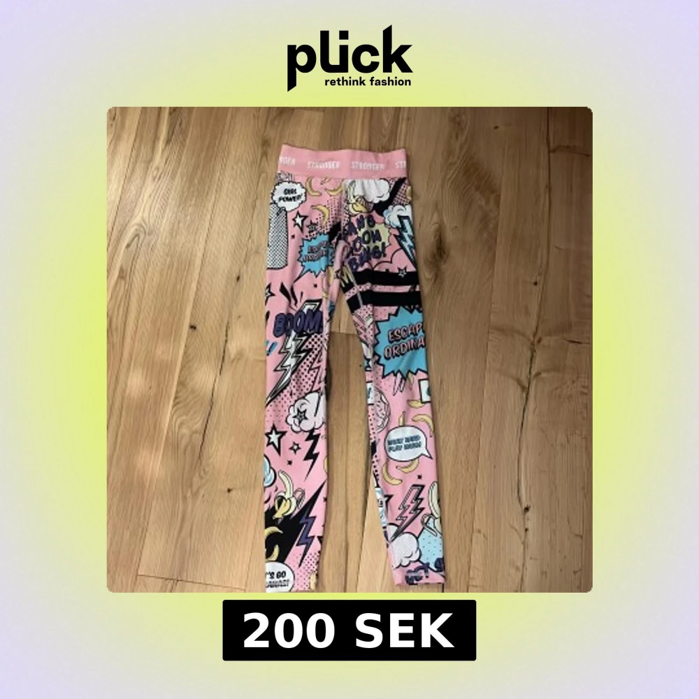 Snygga och färgglada leggings från Stronger med ett coolt serietidningsmönster i rosa, blått och svart. Perfekta för att sticka ut på gymmet eller i vardagen.