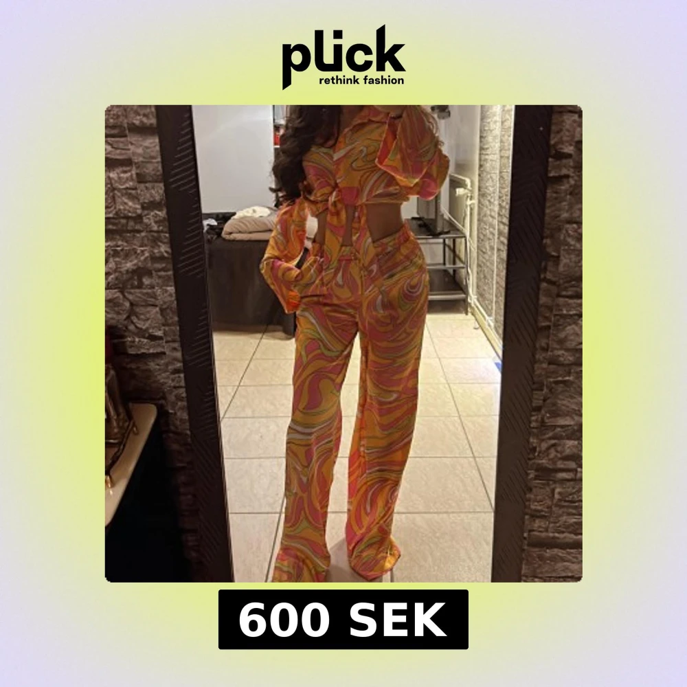 Säljer ett par färgglada byxor med retroinspirerat mönster i orange, rosa och gult. Byxorna har hög midja, vida ben och är tillverkade i ett glansigt, lätt material som känns riktigt skönt. Perfekta för dig som vill sticka ut med en unik stil.
