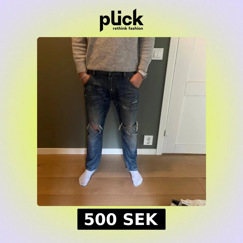Säljer ett par blå jeans från Diesel med snygga slitningar och stora hål vid knäna. Jeansen har klassisk femficksdesign, raka ben och orangea sömmar. Materialet är jeans i bomull och passformen är normal. Perfekta för dig som gillar en avslappnad och trendig look.