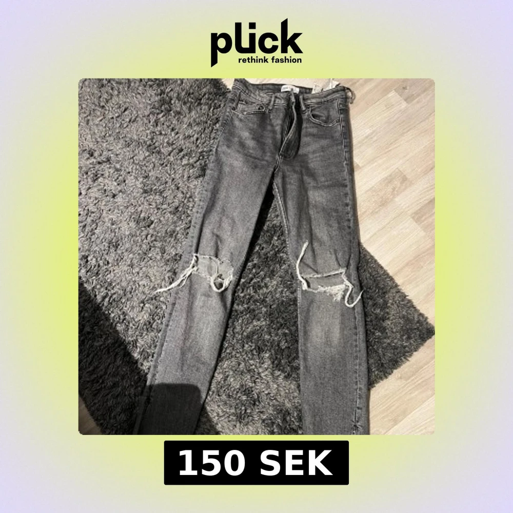 Snygga grå jeans från Zara med slitningar på knäna. De har en klassisk femficksdesign och dragkedja. Perfekta för en avslappnad stil. De är förkortade där nere så de är även inte överdrivet långa !! Säljs inte längre