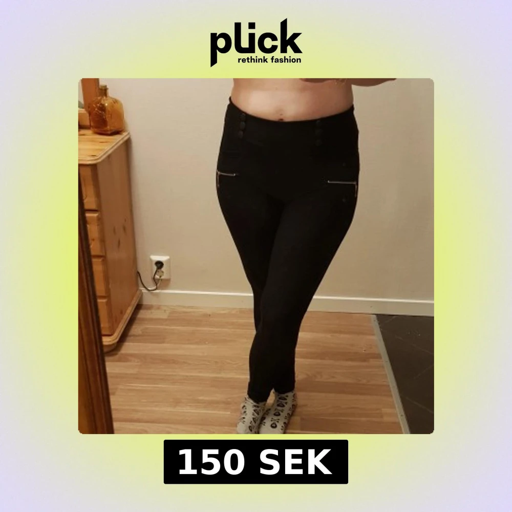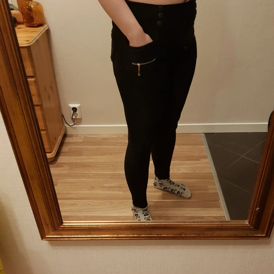Svarta leggings med hög midja och dekorativa dragkedjor framtill. Byxorna har knappar vid midjan och är tillverkade i stretchigt material för en tight passform. Perfekta för en stilren och bekväm look. Ricktiga fickor
