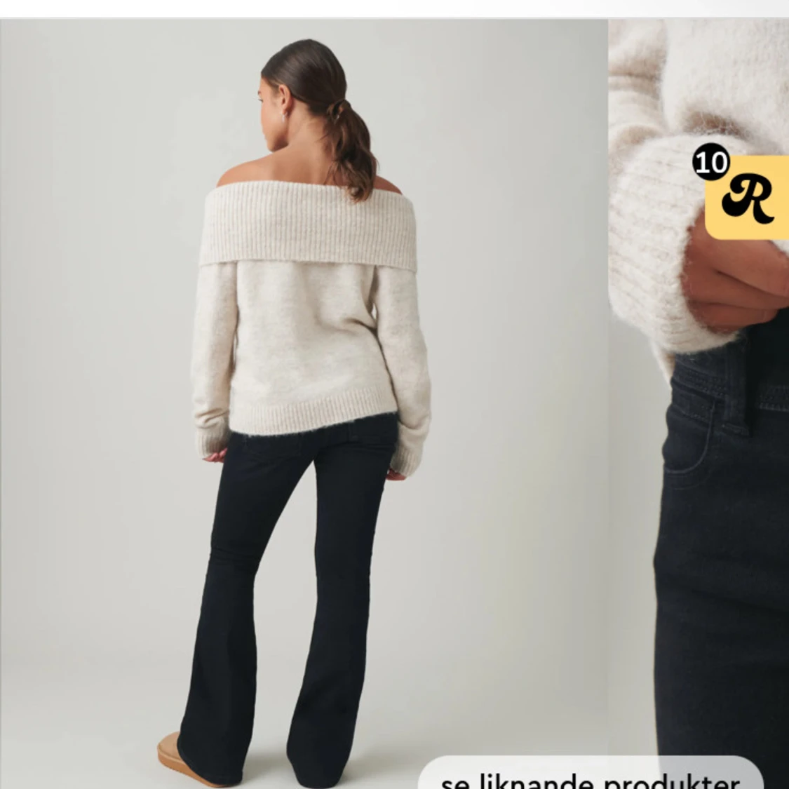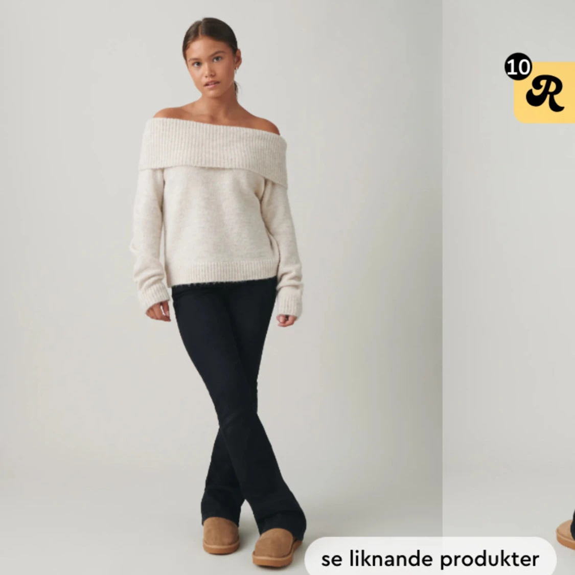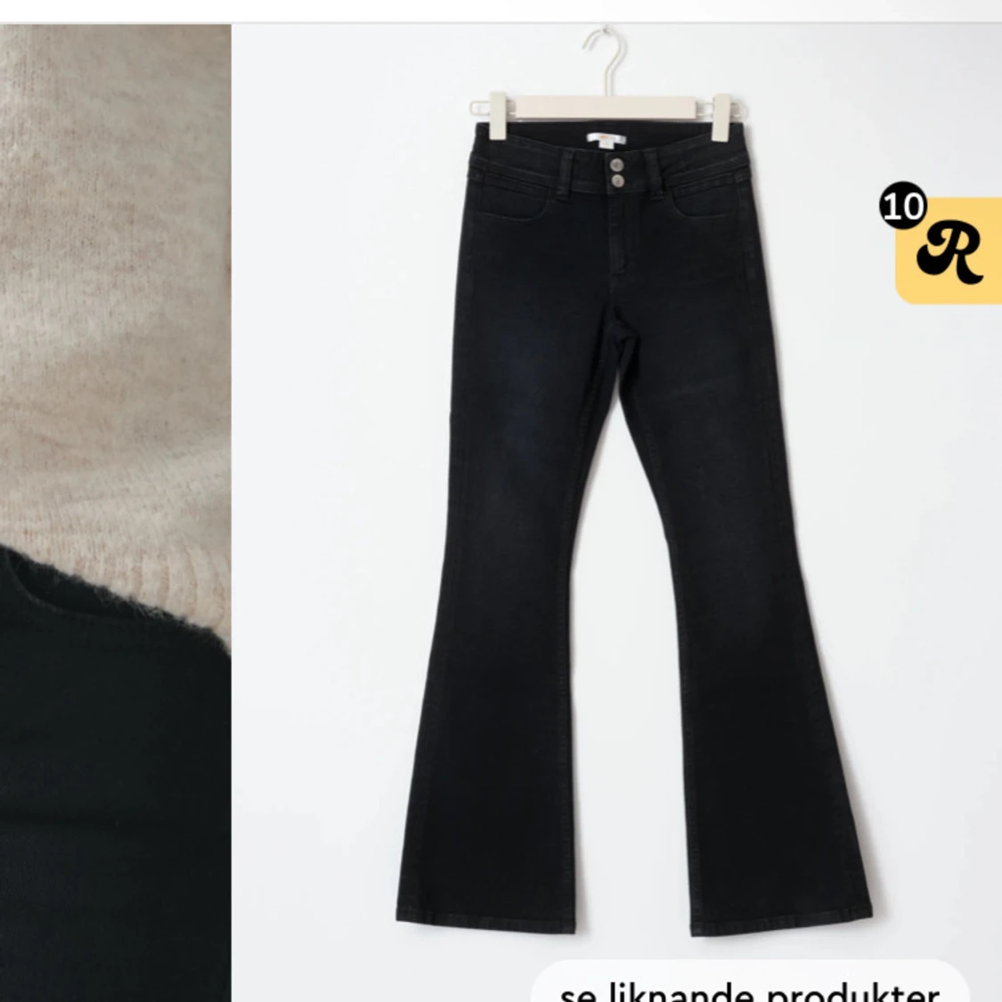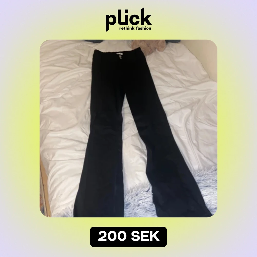 Svarta byxor med utsvängd och bootcut-stil. Byxorna har en dragkedja och knappar framtill.