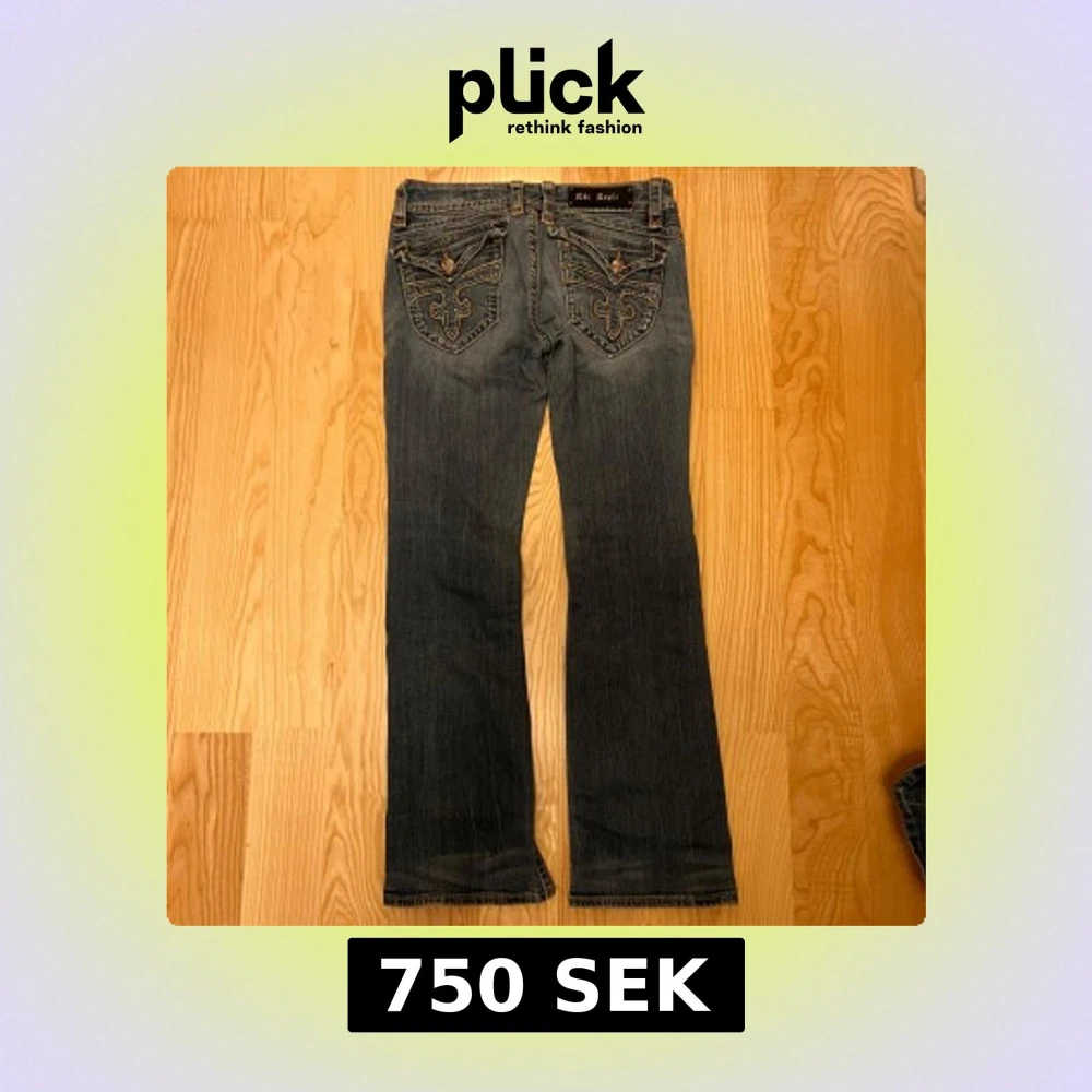 Snygga bootcut jeans från Rock Revival med unika broderade detaljer på bakfickorna. De har en klassisk blå tvätt med slitna effekter och dekorativa nitar. Perfekta för en cool och avslappnad stil. Är ljusblå i verkligheten. Midja: 37cm rakt över. Innerben: ca 75cm