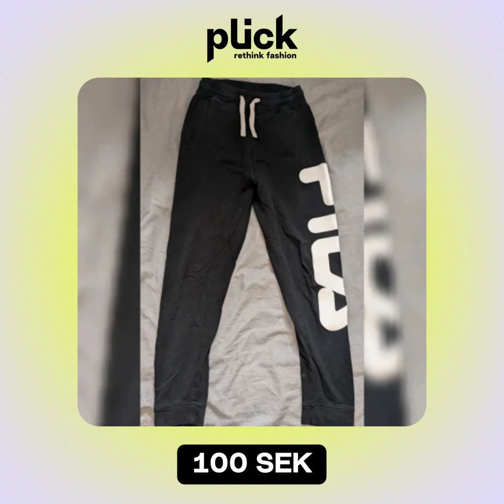 Säljer ett par svarta mjukisbyxor från Fila. De har en bekväm passform med snörning i midjan och ett stort vitt Fila-tryck på benet. Perfekta för en avslappnad dag hemma eller på gymmet.