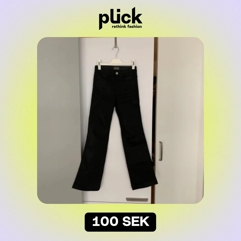 Filippa K jeans i något tjockare lite glansigt jeansmaterial. Har sytt upp de så att benlängden är 73 cm (mätt från grenen) Stretchiga men tyvärr för små för mig. Lätt bootcut Strl XXS Nyskick