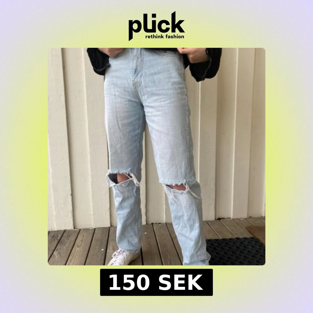 Säljer ett par ljusblå jeans från Gina Tricot med slitna knän för en trendig look. Jeansen har en hög midja och en straight passform. Perfekta för en avslappnad stil. Passar perfekt med tröjan modellen har på sig över som jag också säljer🌸😻❤️💗