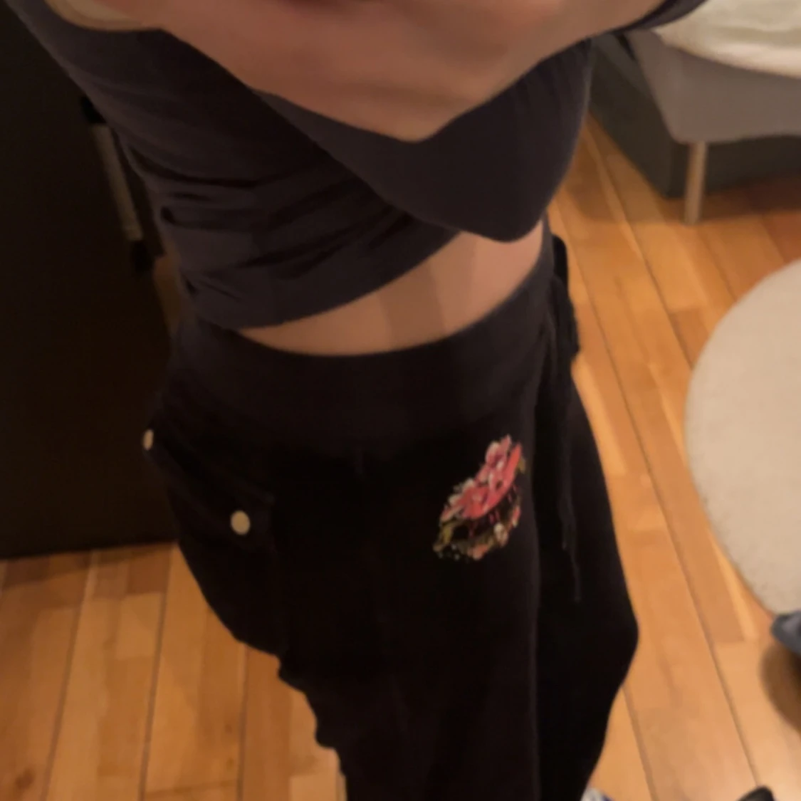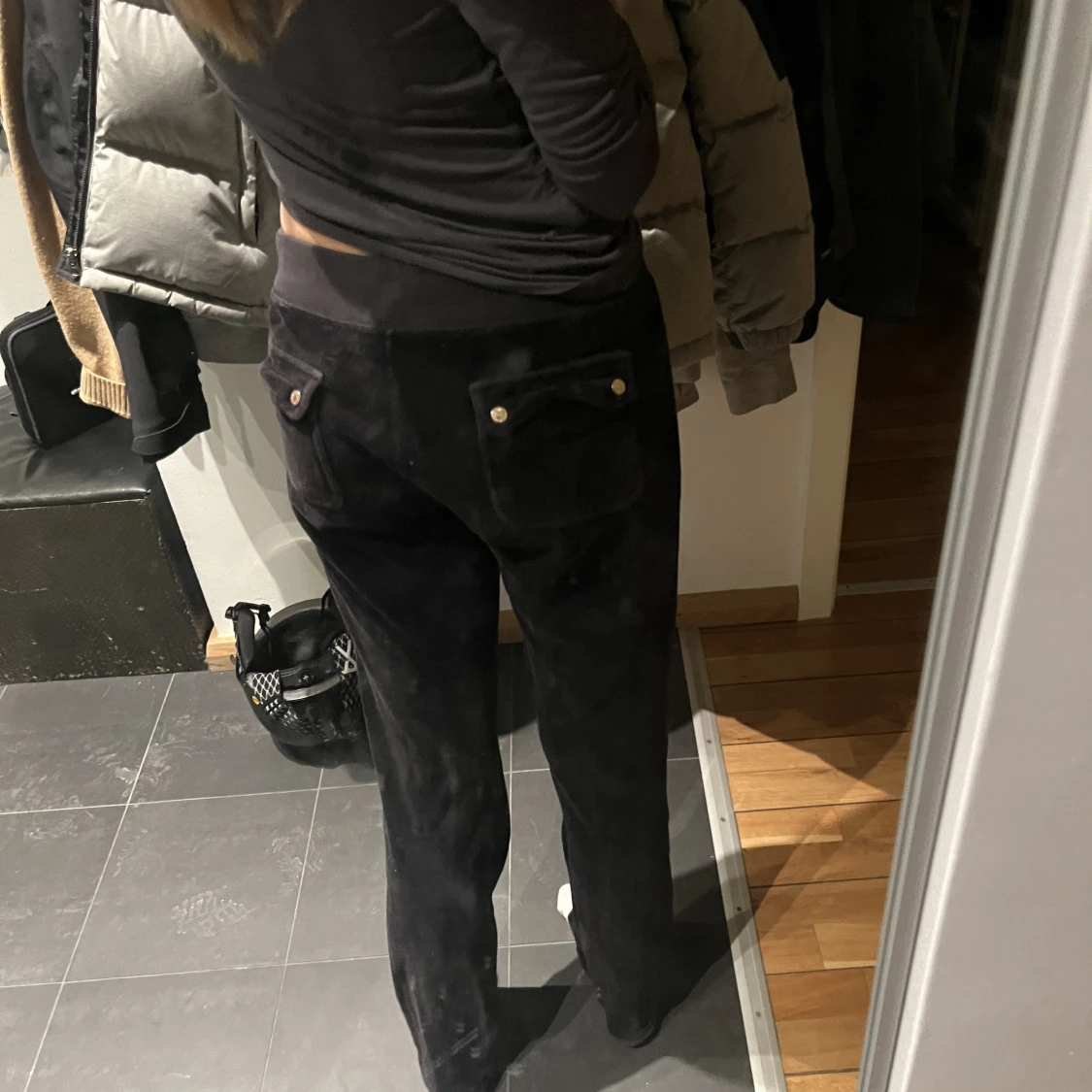 Säljer åkte svarta lågmidjade juicy couture byxor med fickor och en fin detalj på framsidan