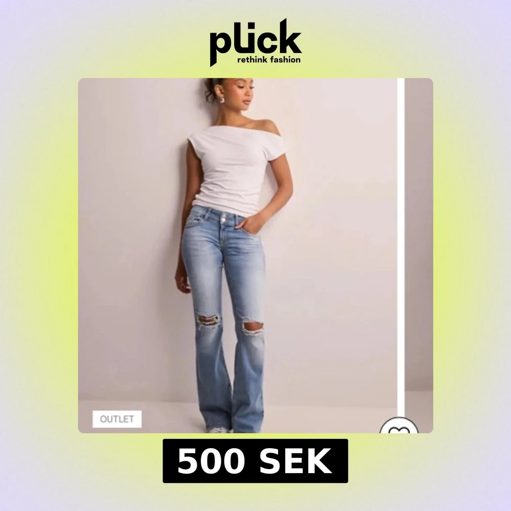 Snygga ljusblå jeans med bootcut passform och slitna detaljer över knäna. Jeansen har klassiska fickor fram och bak, samt dubbla knappar i midjan. Perfekta för en avslappnad och trendig look. Pris kan alltid diskuteras! ❤️Inga skador alls, fint skick!