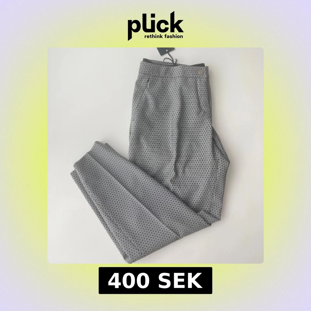 Snygga grå kostymbyxor från Rosner med diskret geometriskt mönster. Byxorna har slim passform, midwaist och klassiska fickor fram samt passpoalfickor bak.