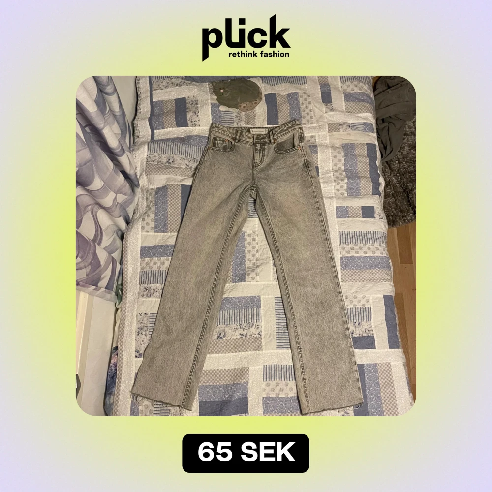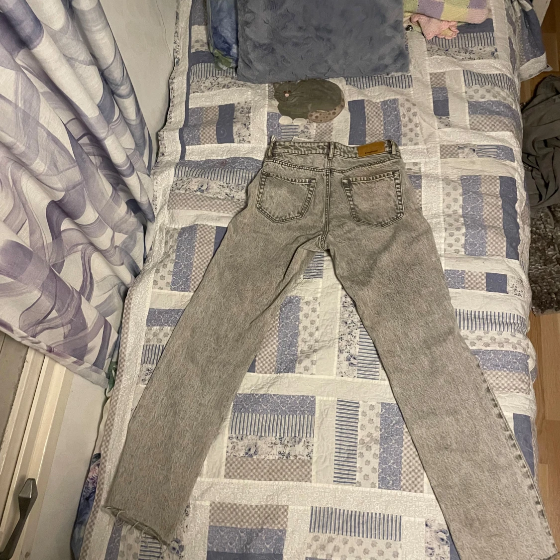 Säljer ett par grå jeansbyxor i bra skick. De har en straight passform och är perfekta för både vardag och fest. Byxorna har en klassisk design med fem fickor och knappgylf. Perfekta för höst och vår!