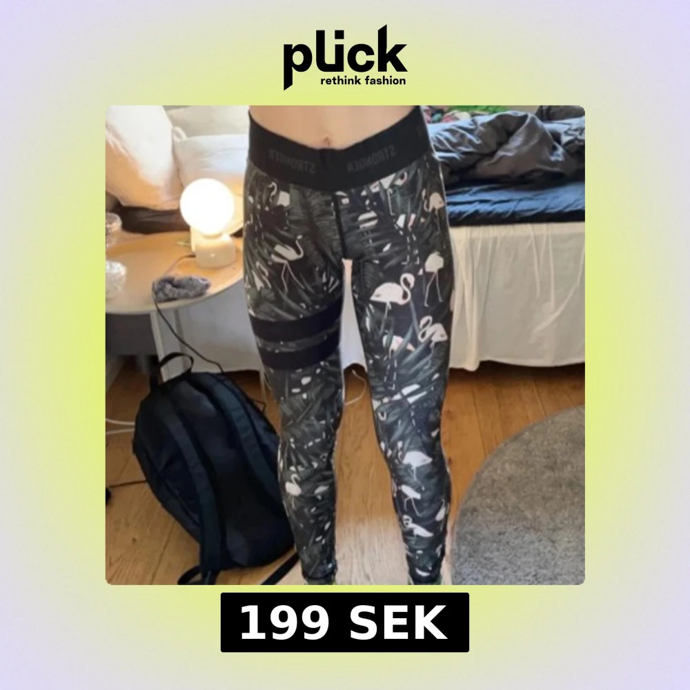 Snygga svarta träningstights från Stronger med tropiskt mönster och vita flamingos. Två svarta ränder på ena benet. Perfekta för gymmet eller yoga. Stretchigt material som sitter skönt på kroppen. Köpt för 899 kr!