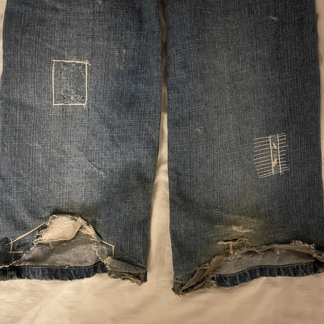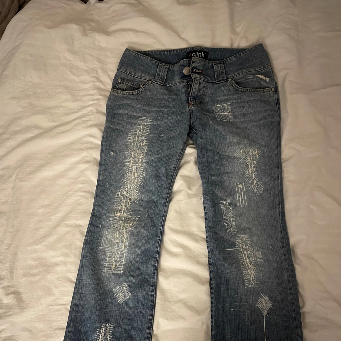 Säljer ett par blå lågmidjade jeans från Clink med slitningar och broderade detaljer. Har lite slitningar längst ner där bak på benen. Midjemått rakt över är 43 cm och innerben är 83 cm💞💞skriv för fler frågor