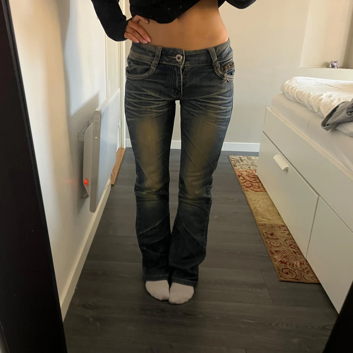 Säljer dessa lågmidjade bootcut/flare jeans med supersnygga fickor! Storlek: ca XS Midjemått: ca 37cm 💙 pris kan diskuteras, skriv vid frågor